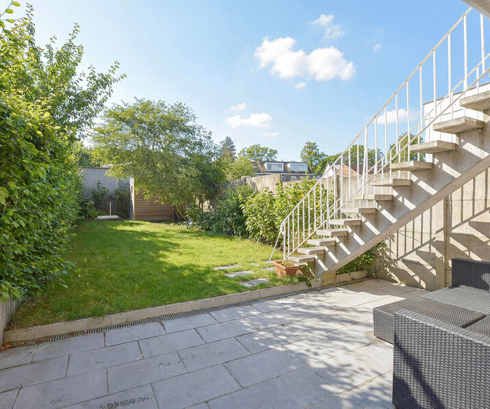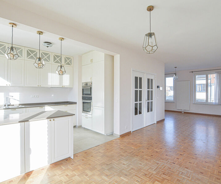 Bright L-shaped living room of +/-35 m² with open fireplace, fully equipped open kitchen with breakfast area, terrace with access to the south-west facing garden of +/-75 m² with garden shed.