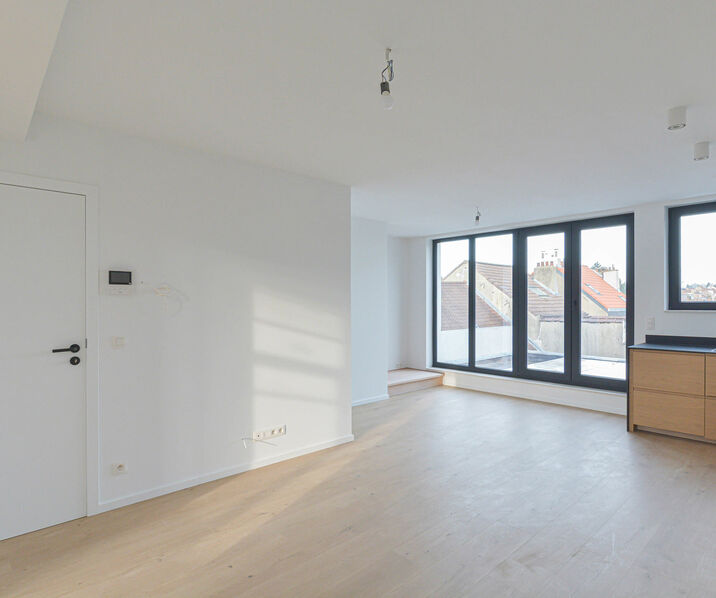 It is located in a peaceful area near Keym Square. With easy access to public transport, shops, and schools, this apartment enjoys an excellent location. Its proximity to the Sonian Forest also makes it ideal for those who want to combine peace and nature with good accessibility to the city center. This fully renovated apartment of +/-76 m² (according to EPC) is situated on the 2nd and 3rd floors of a small-scale building without an elevator and is composed as follows: