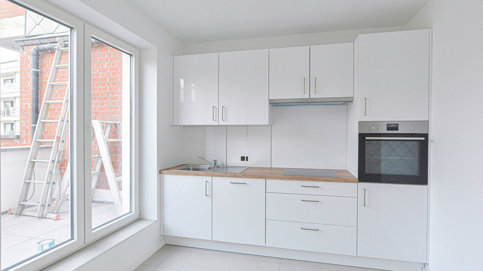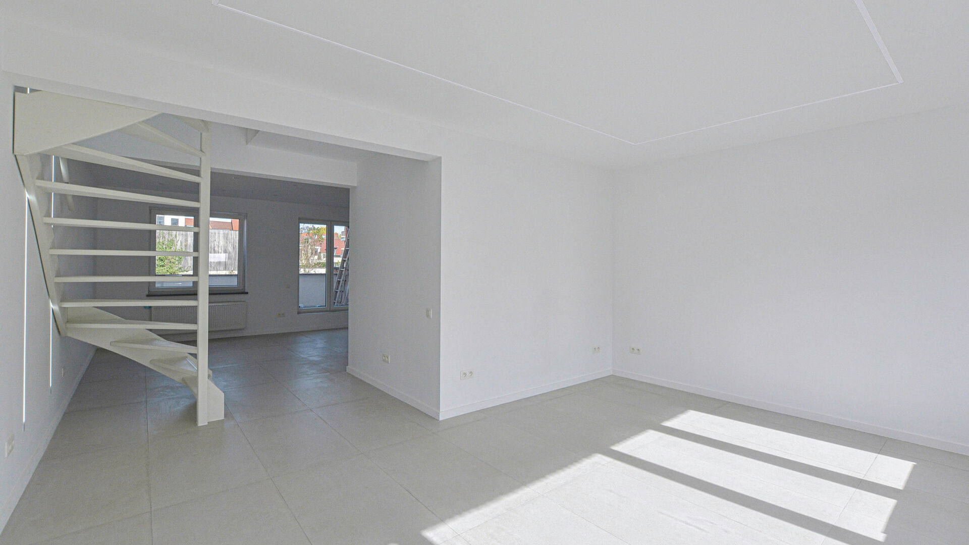 Entrance hall with separate WC // bright living room ±20m² // dining room ±12.5m² // semi-equipped open kitchen (electric hob, oven, dishwasher (no fridge)) with access to the rear terrace ±9m²
