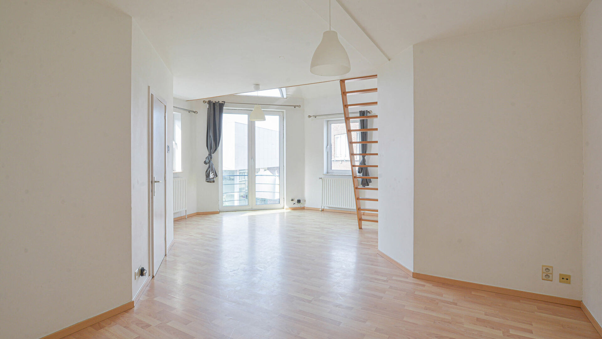 Entrance hall, bright living-dining room +/-27m² giving access to a small terrace, equipped kitchen, night hall with toilet, first bedroom +/-14m² with en-suite bathroom (bathtub with shower, sink and connection washing machine). 2nd bedroom/polyvalent space +/-16m² under 'mezzanine' with office area.