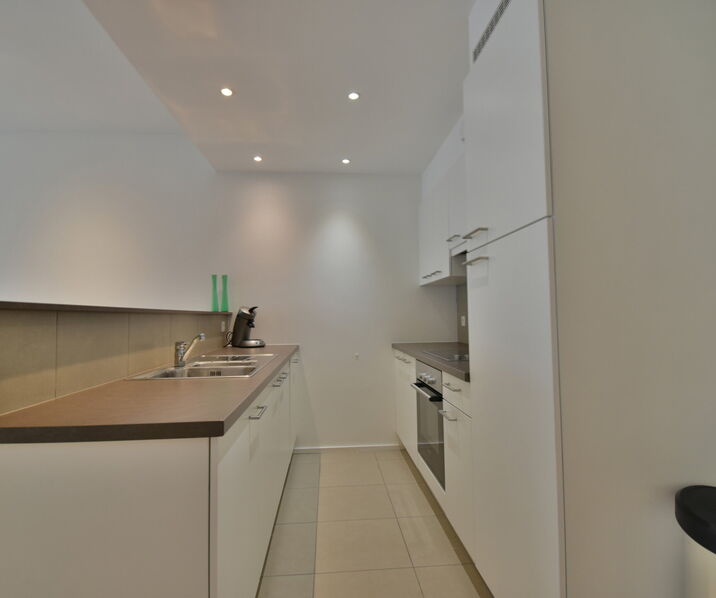 Entrance hall with separate toilet // storage room // living room +/- 30m² with access to the southwest-facing terrace +/-11m² // fully equipped kitchen (sink, cooking plates, extractor hood, dishwasher, fridge with freezer) // bedroom +/- 14m² // bathroom (bathtub with shower, double sink).