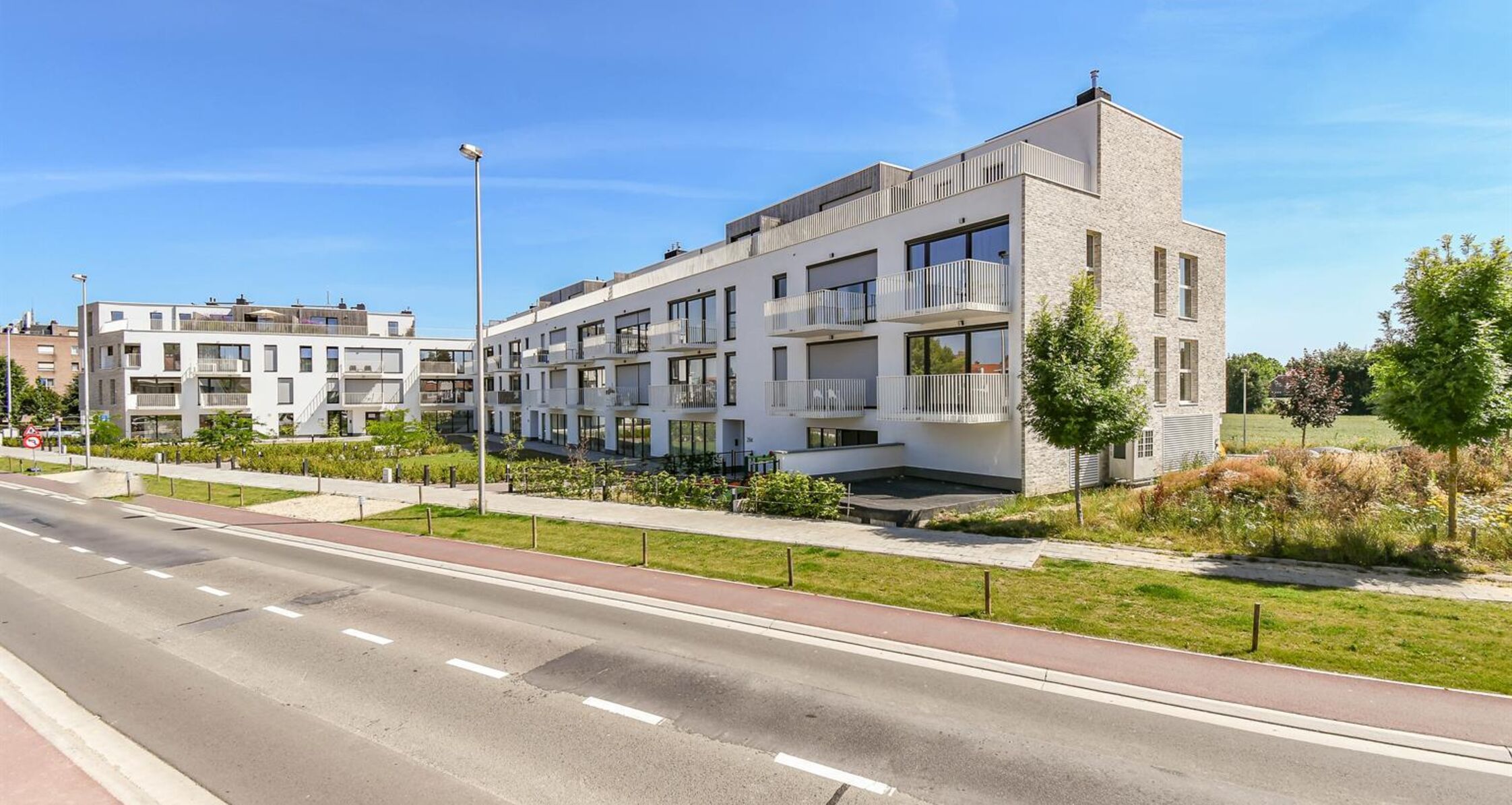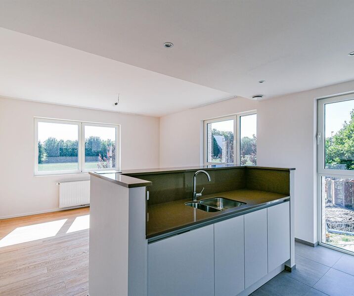 Entrance hall // separate toilet // living room +/- 15m² giving access to the terrace (SOUTH) +/- 5,80m²// fitted kitchen // dining area +/- 13m² // 2 bedrooms +/- 11,5-11,5m² // bathroom // laundry area //