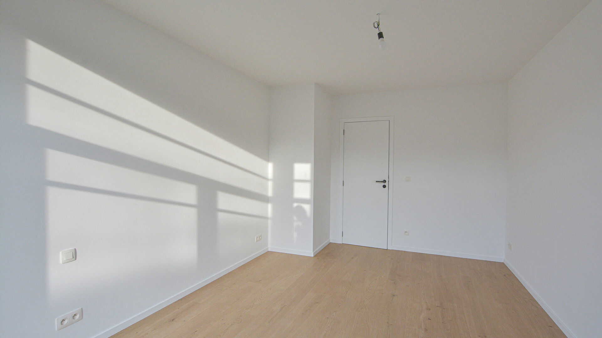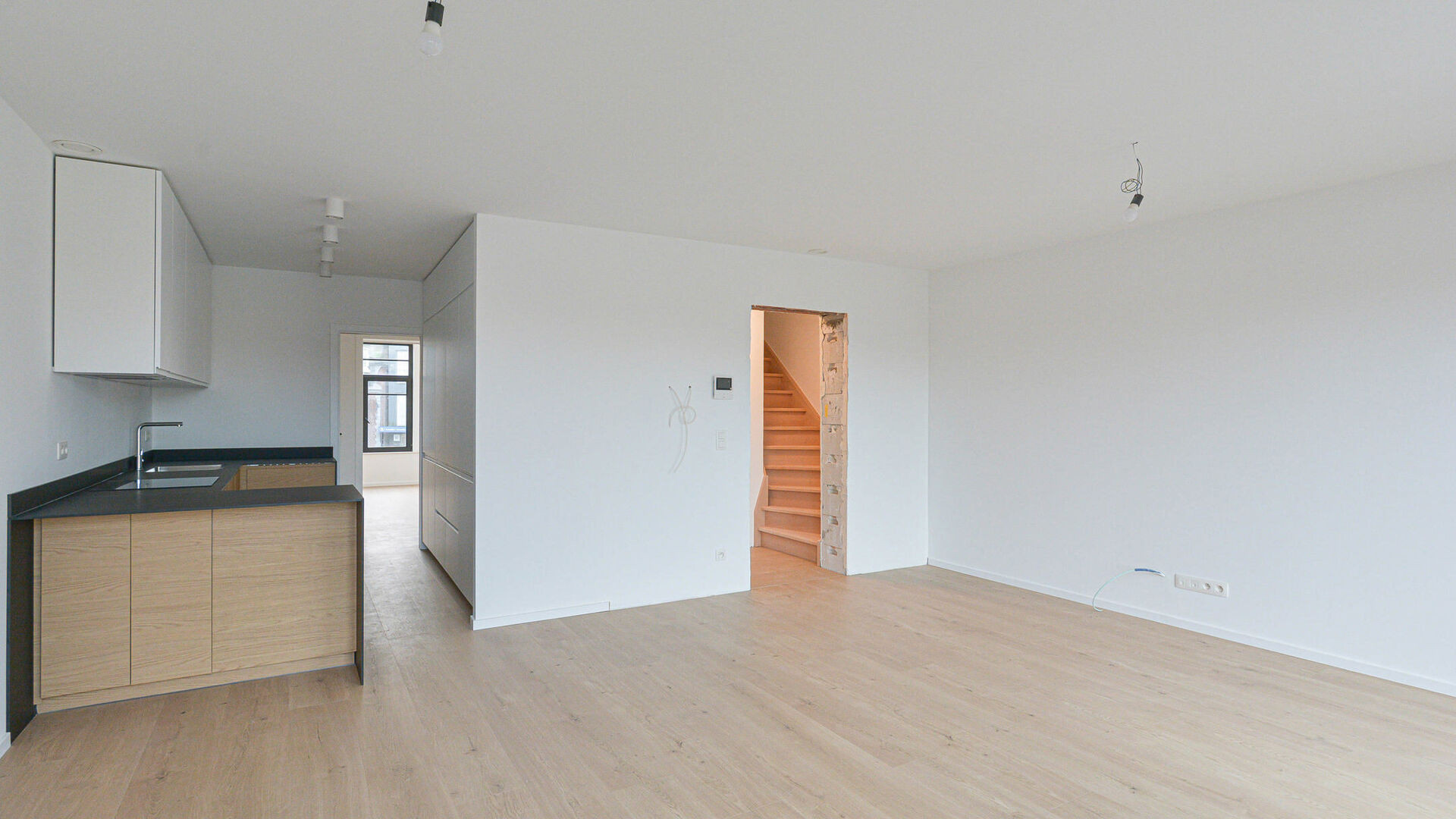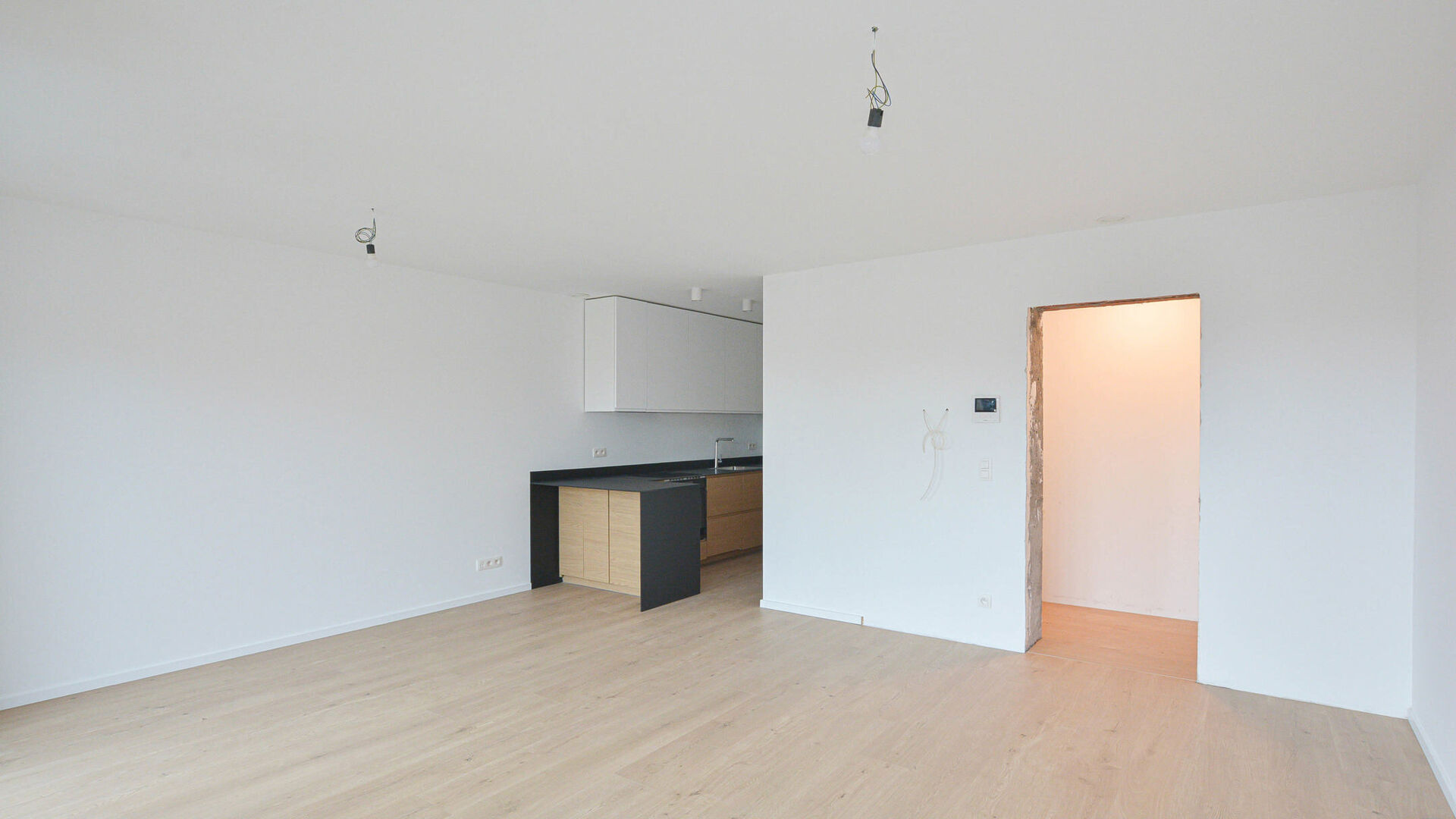 Bright living and dining room of +/-32 m² with access to a small terrace and a fully equipped kitchen, a night hall with a separate toilet, two bedrooms of +/-15 m² and +/-10 m², and a bathroom fitted with a walk-in shower, sink and washing machine.