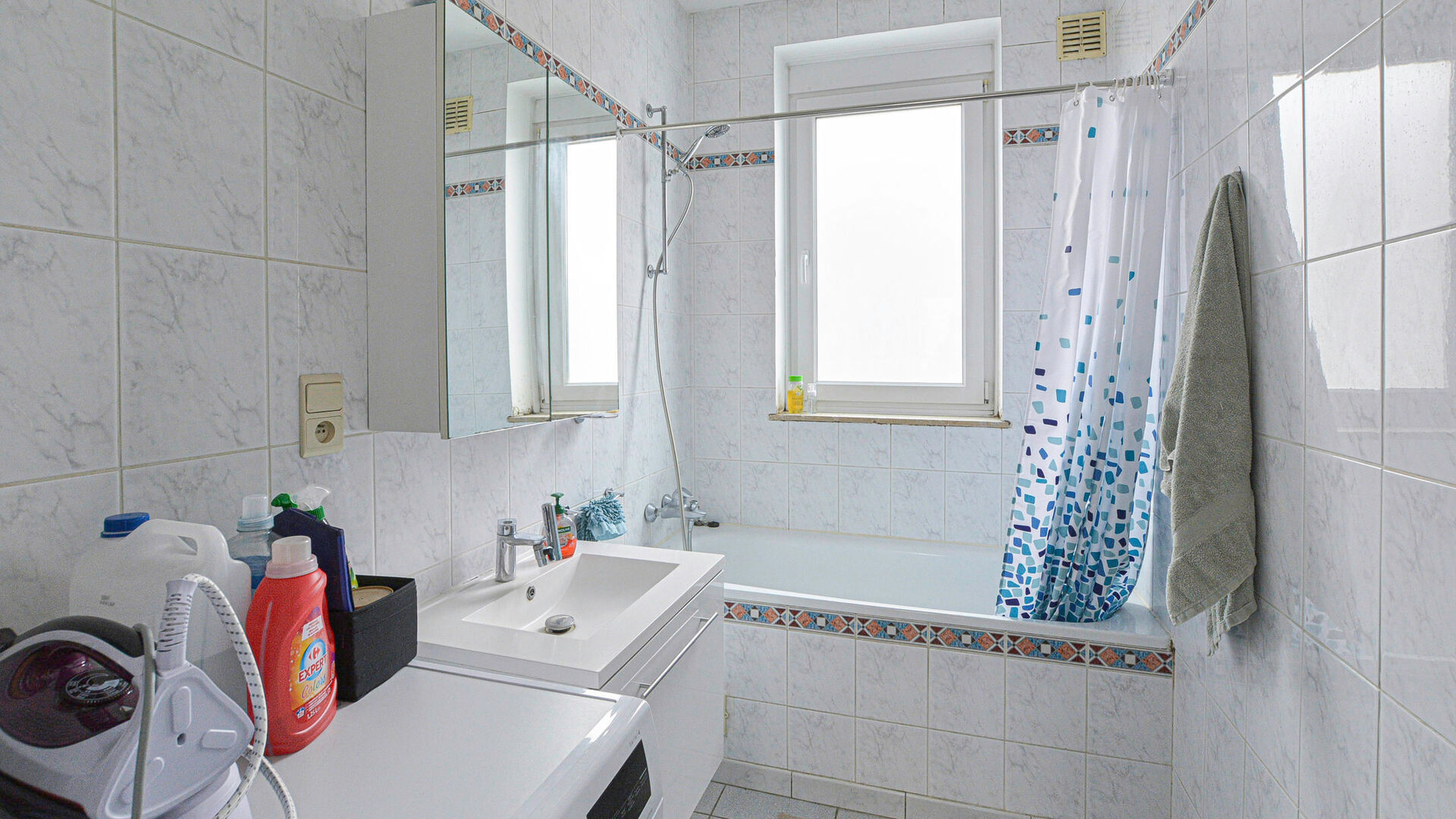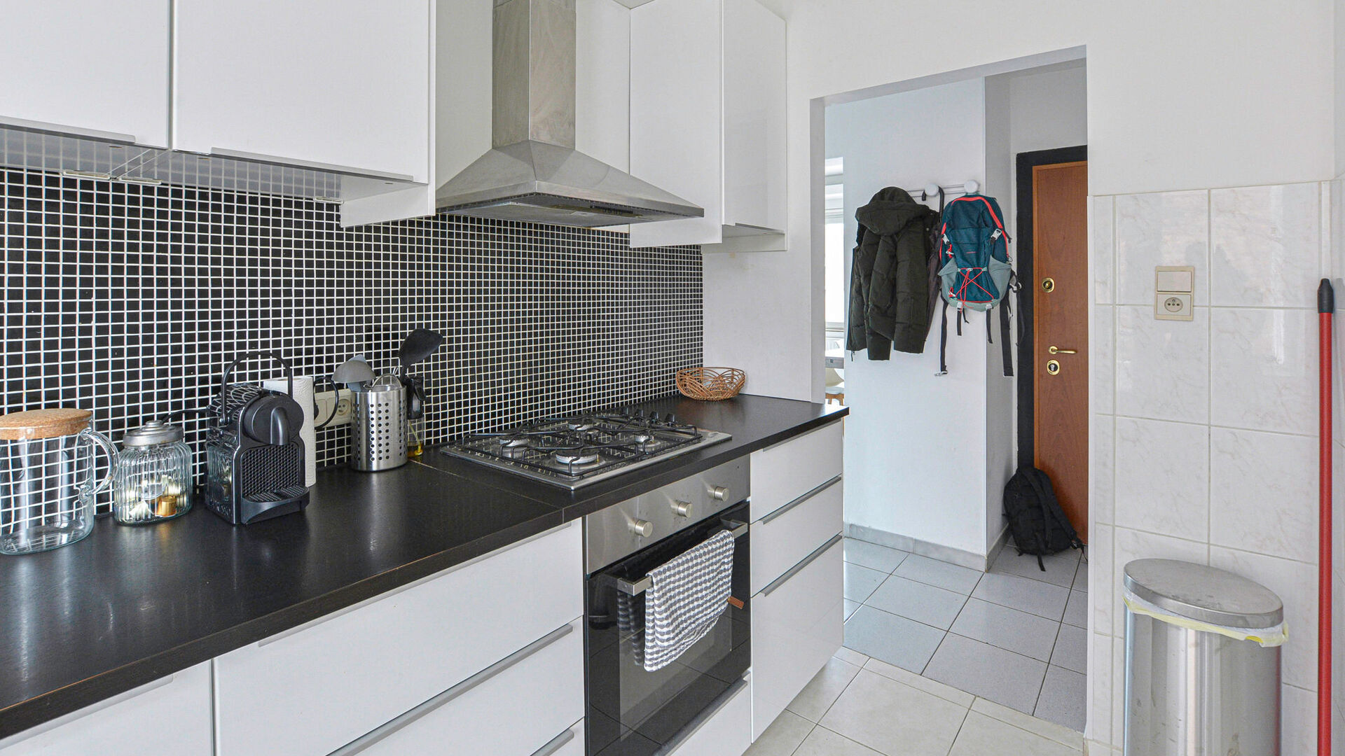 Entrance hall with separate toilet // bright living room +/-24 m² // semi-equipped kitchen (fridge with freezer, oven, hob) with access to the balcony // bedroom +/-12 m² // bathroom with bathtub, sink, and laundry area.