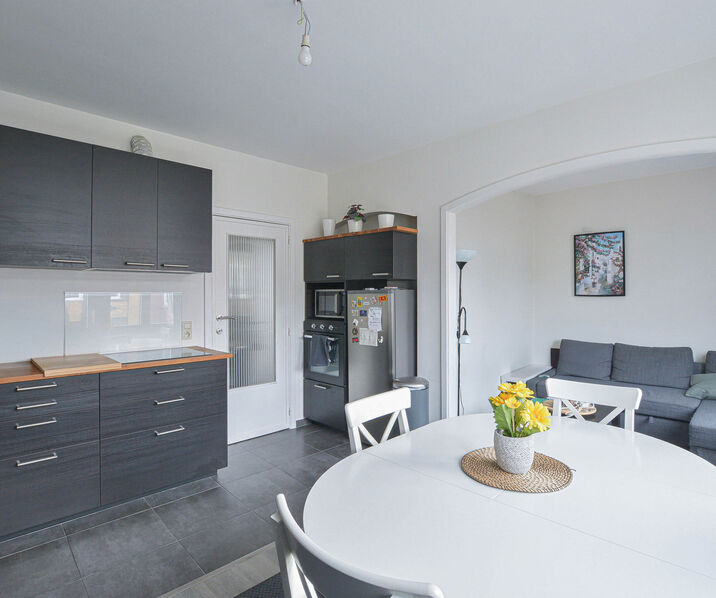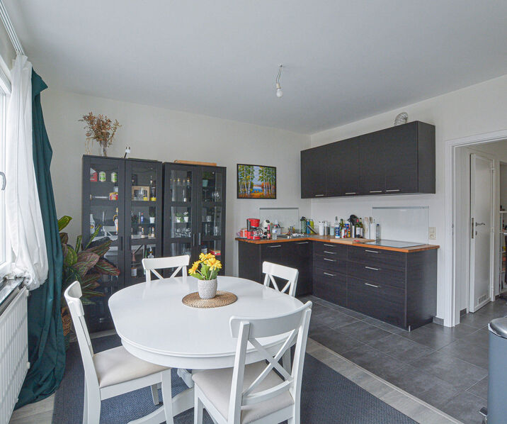 Entrance hall with separate toilet, living area +/- 20m² with fully equipped open kitchen (cooker, oven, dishwasher, fridge/freezer), 2 bedrooms +/- 14m-11m², bathroom equipped with walk-in shower, sink and place for a washing machine // large cellar //