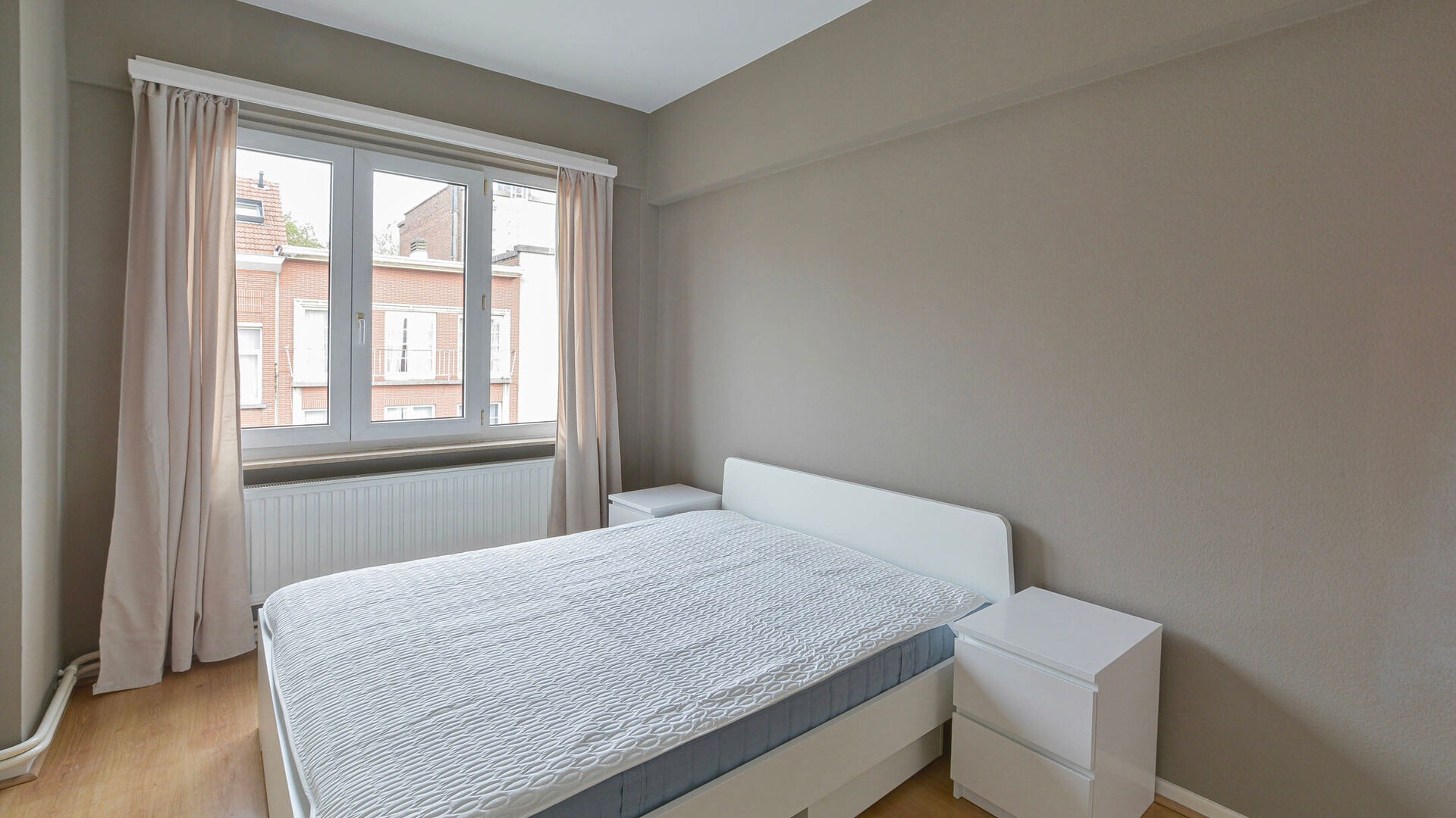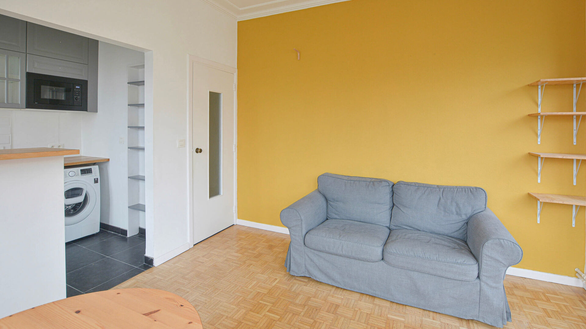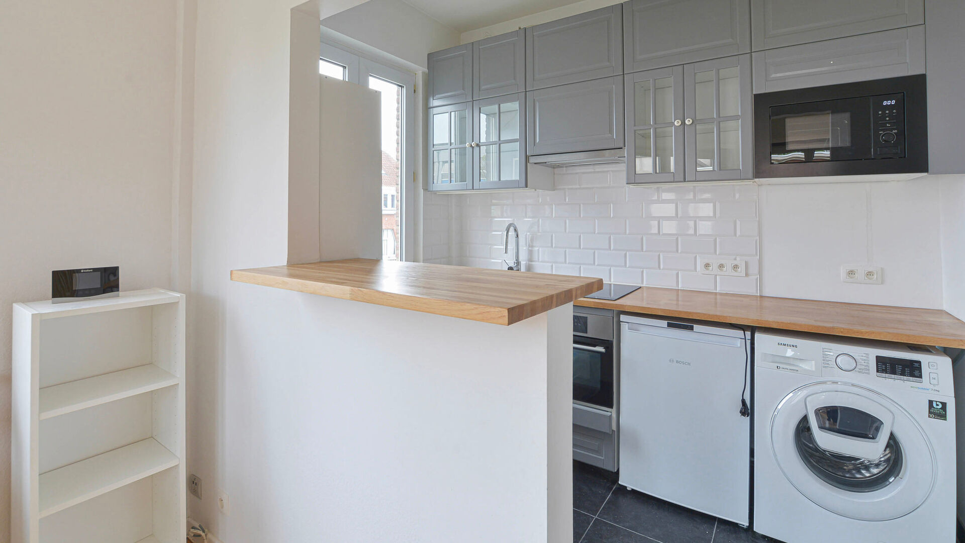 Entrance hall with separate toilet and cloakroom space // bright living room +/- 15.3 m² // fully equipped kitchen (fridge, oven, microwave, electric hob, washing machine) // bedroom +/- 14 m² with adjoining bathroom (bathtub, sink, and storage) // cellar.