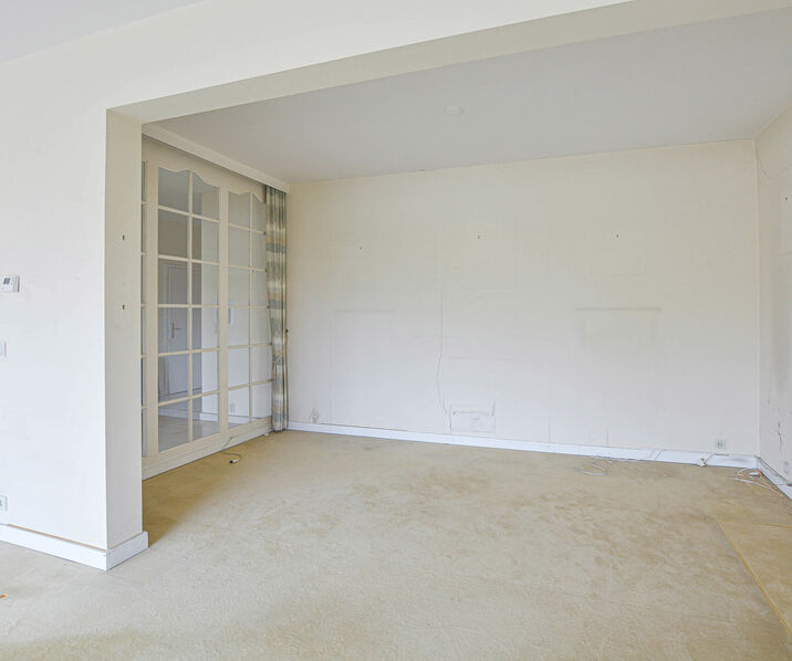 An entrance hall with guest toilet and built-in wardrobe, a spacious living and dining room of +/- 45 m² with access to a terrace, and a equipped kitchen with breakfast corner (possibility to open the kitchen to the living). The night hall includes a second toilet, a closet, and a storage room. The master bedroom of +/- 16 m² has an en-suite bathroom (bath, shower, and double sink). There are also two additional bedrooms of +/- 13 m² and 12 m², as well as a second bathroom with bath, double sink, toilet, and connection for a washing machine. A cellar and a mandatory parking space + €30.000 are sold together with the apartment.