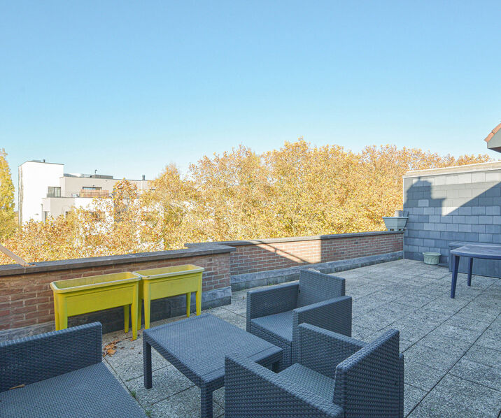 Entrance hall with built-in wardrobes, bright living and dining room of +/-35m² with a fully equipped open kitchen, providing access to two large terraces. Bedroom of +/-10 m² with built-in wardrobe, bathroom with bathtub, toilet, and sink.