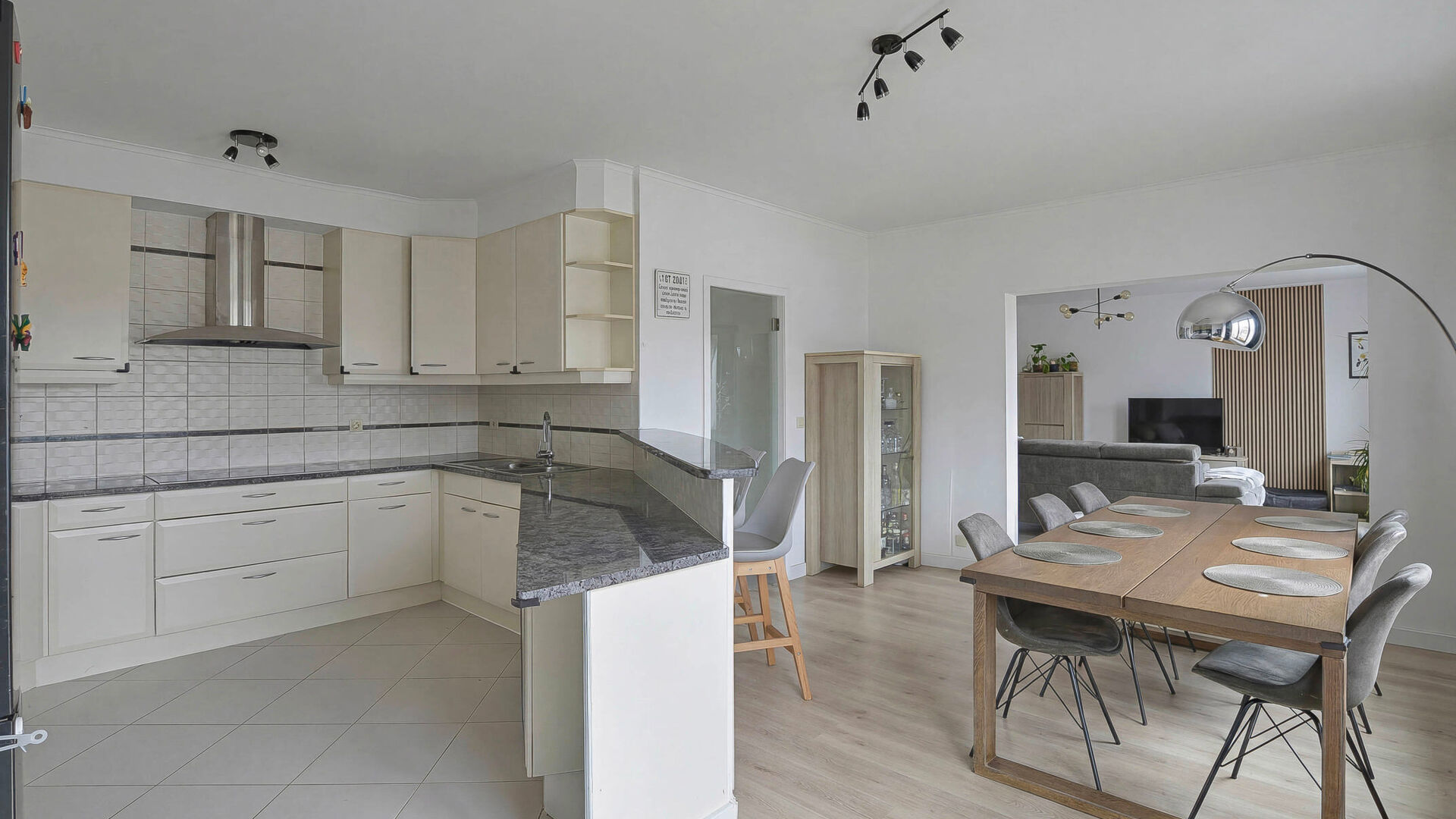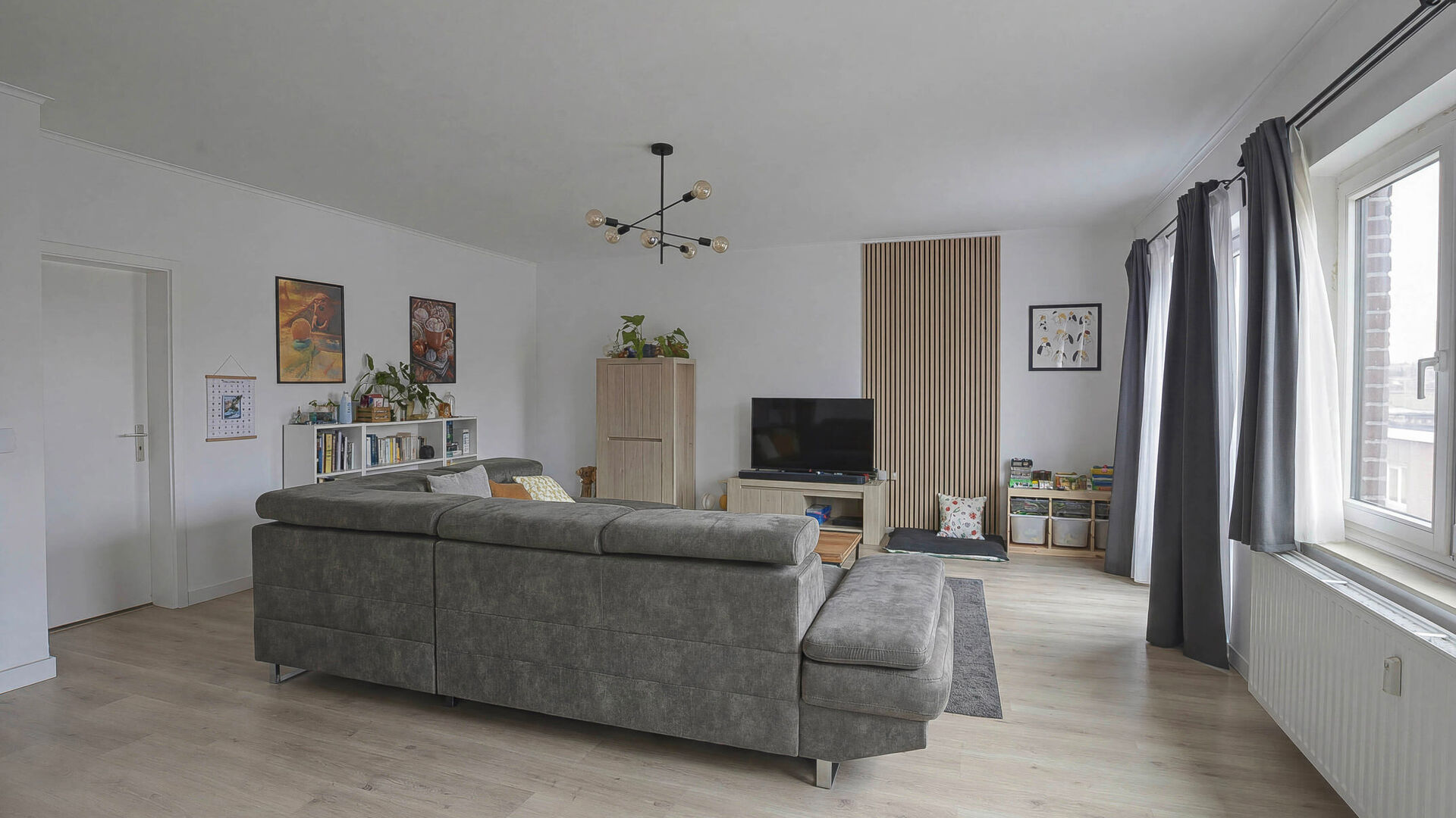 Entrance hall with cloakroom area, bright living room of +/-50 m² with a fully equipped open kitchen, 2 spacious bedrooms of +/-20 m² and 14 m², renovated bathroom (walk-in shower, toilet, sink, and connections for a washing machine/dryer), 3rd bedroom suitable for a child or office of +/-7 m², and a second bathroom (bathtub, sink, and toilet).