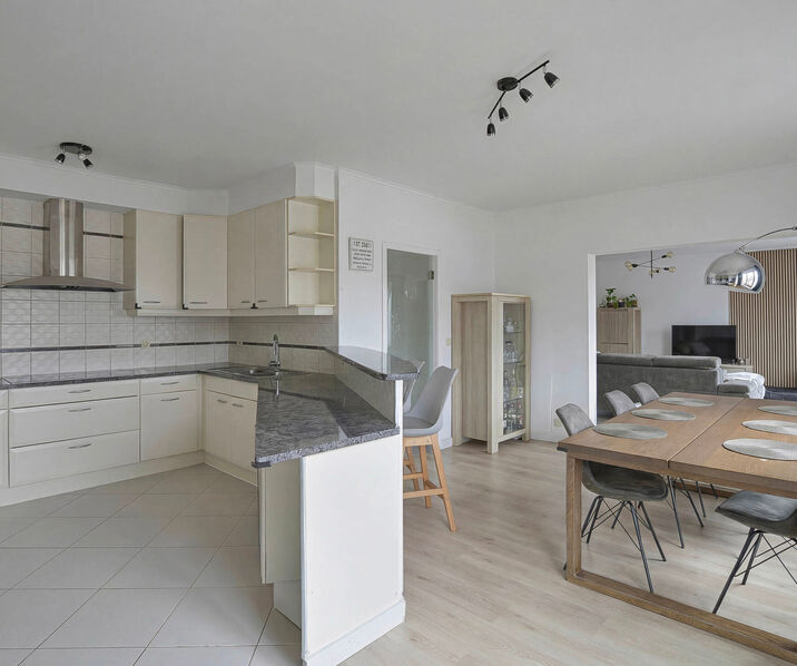 Entrance hall with cloakroom area, bright living room of +/-50 m² with a fully equipped open kitchen, 2 spacious bedrooms of +/-20 m² and 14 m², renovated bathroom (walk-in shower, toilet, sink, and connections for a washing machine/dryer), 3rd bedroom suitable for a child or office of +/-7 m², and a second bathroom (bathtub, sink, and toilet).