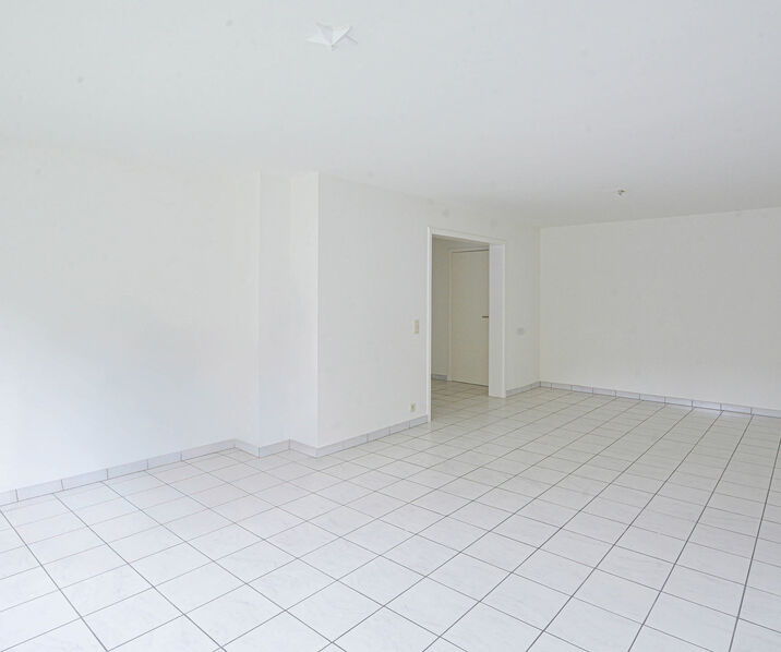 Entrance hall with cloakroom and separate toilet leads to a bright living and dining room of +/-30m², fully equipped kitchen with hob, oven, dishwasher, fridge/freezer and connection for a washing machine. A night hall with storage space gives access to two bedrooms of +/-15m² and 11m², one of them giving access to the south-facing terrace of +/-10m².