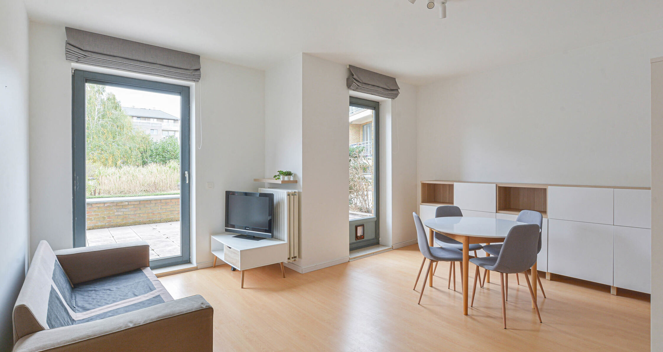 Entrance hall with built-in wardrobe and separate toilet, bathroom with bathtub and sink. The bright living and dining room of +/-21 m² gives access to a large terrace, fully equipped kitchen with storage/technical room and a bedroom of +/-14 m².