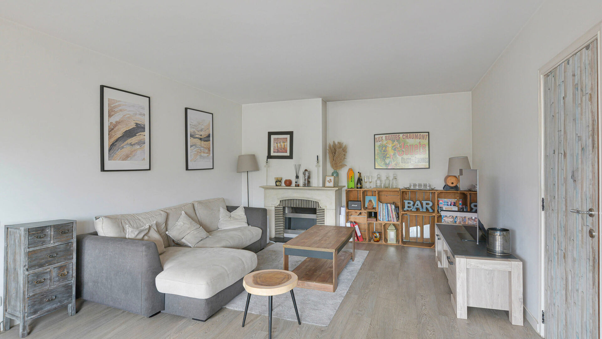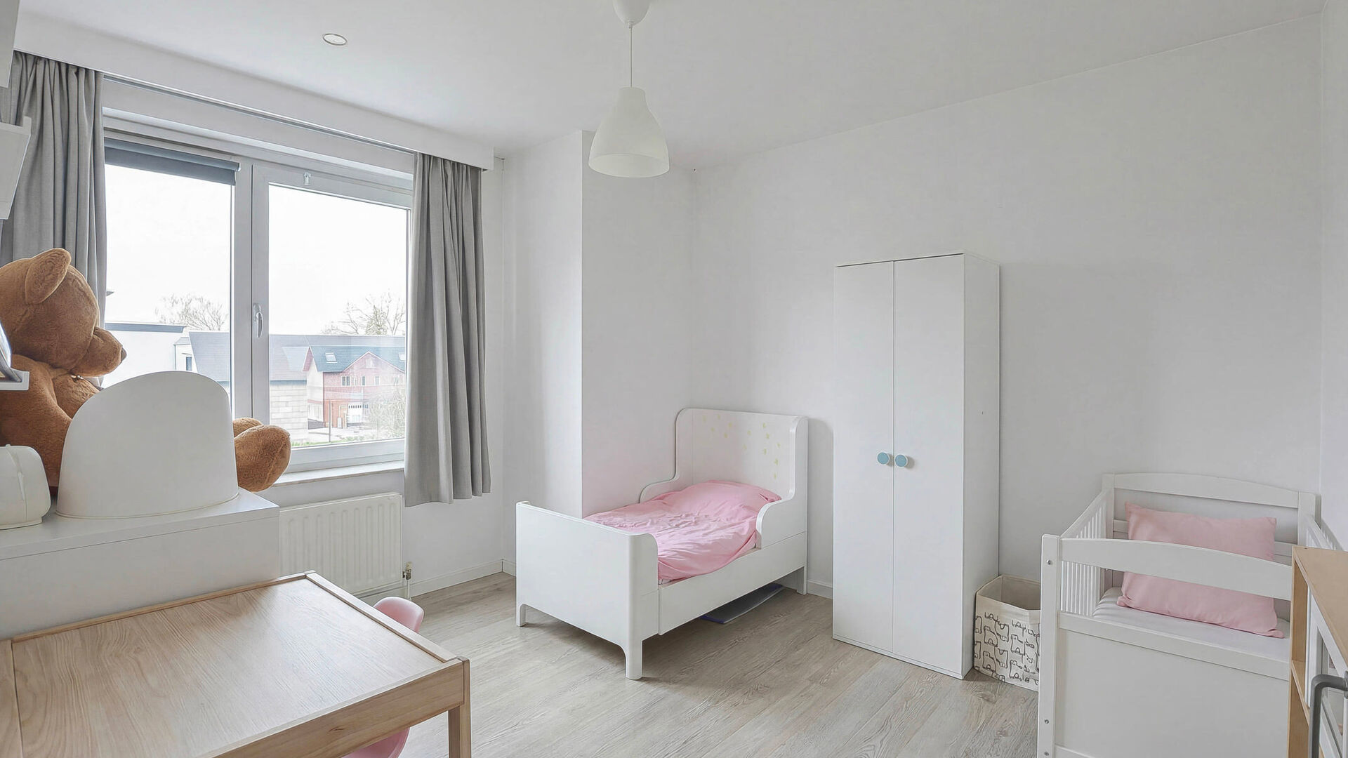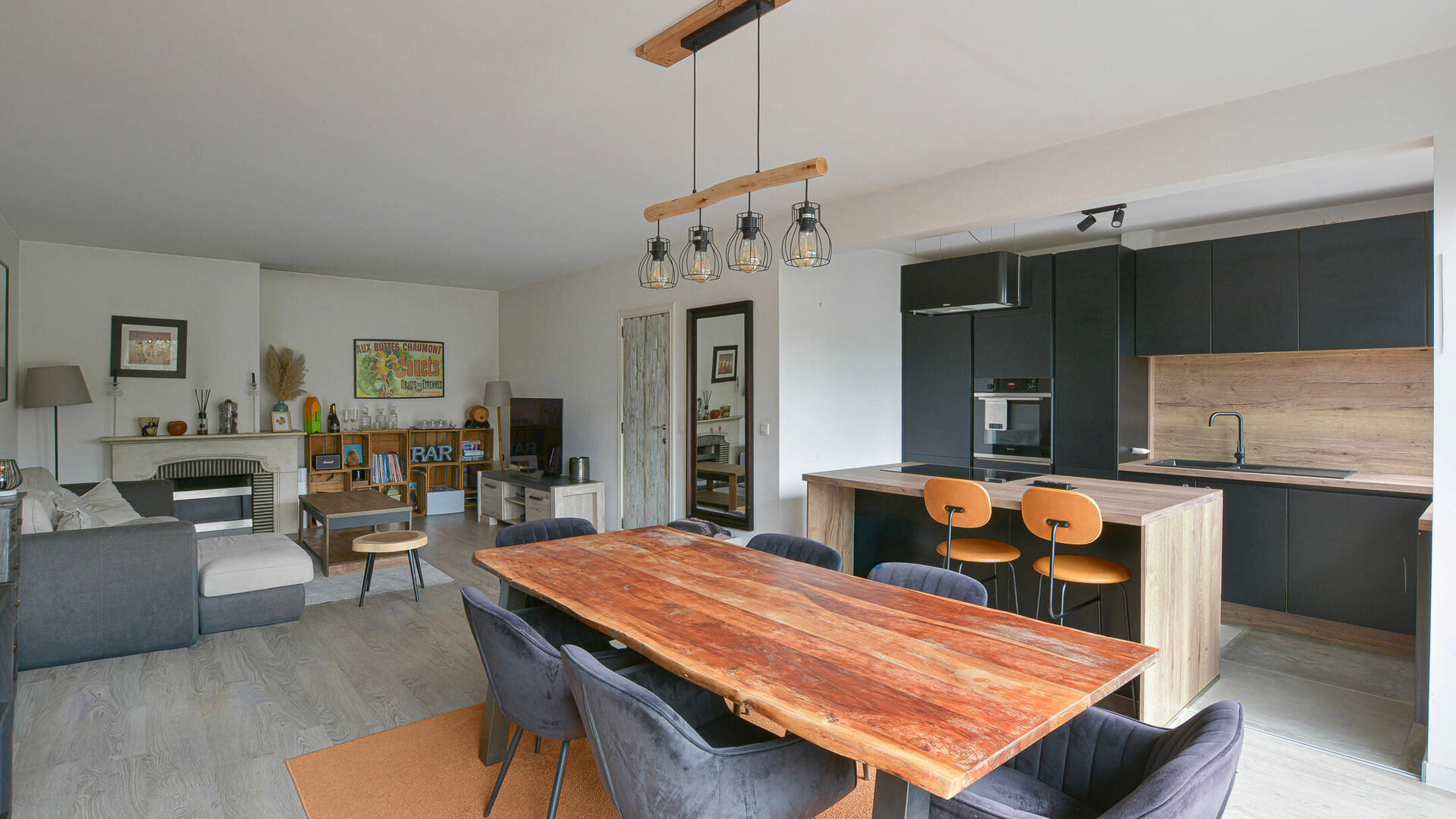 Entrance hall with cloakroom and storage room with connections for a washing machine/dryer. Bright living-dining room of +/-36 m² giving access to a south-facing terrace, fully equipped open kitchen with central cooking island / breakfast area. Night hall with toilet, 2 bedrooms of +/-15 and 12 m², bathroom with bathtub and sink.