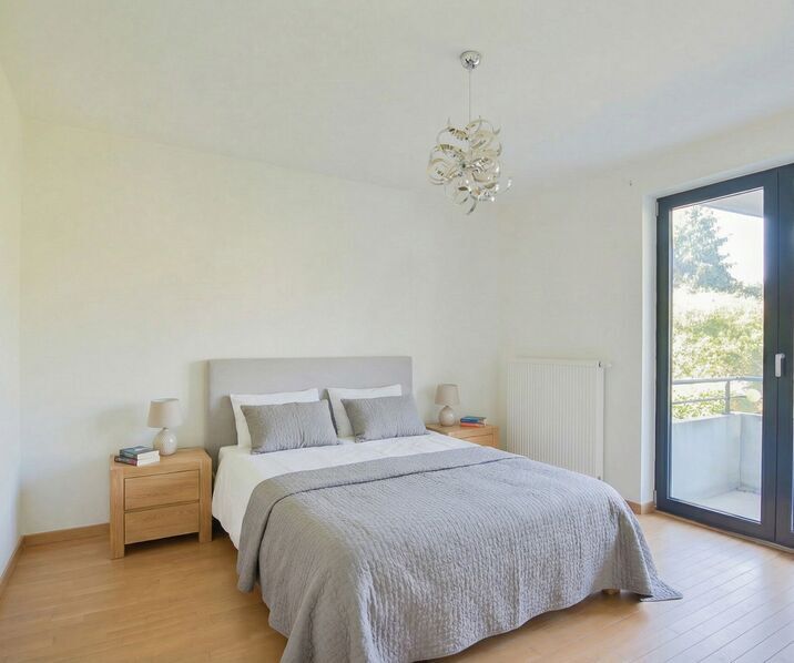 Entrance hall with cloakroom and separate toilet, a practical storage/laundry room, spacious and bright living-diningroom of +/-32m² with super-equipped kitchen giving access to a south-facing front terrace. The night hall leads to a first bathroom with shower and sink, 1st bedroom of 11m² and a master bedroom of +/-15 m² with en-suite bathroom (bathtub, double sink and toilet) and access to a second terrace.