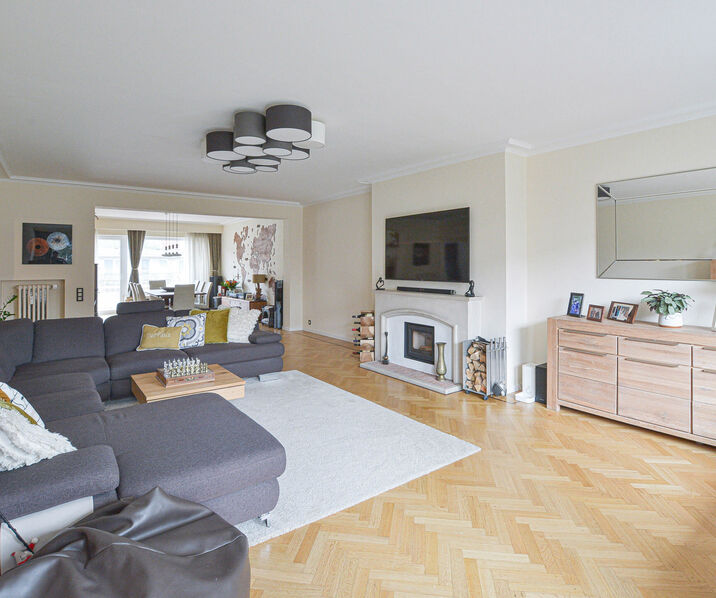 Spacious entrance hall with built-in cloakroom, bright living and dining room of +/- 60m² with working fireplace on wood and access to two large terraces (SOUTH/NORTH), the south-facing terrace of +/- 15m² offering an open view over the surrounding gardens. New fully equipped kitchen (hob, classic oven with microwave function, steamoven, dishwasher, fridge/freezer) with breakfast area. Night hall with separate toilet, master bedroom of +/- 16m² with en-suite bathroom (shower and sink) and access to the south-facing terrace, 2 bedrooms of +/- 11-10m², new bathroom (bathtub with shower, sink), storage room with connection for washing machine/dryer.