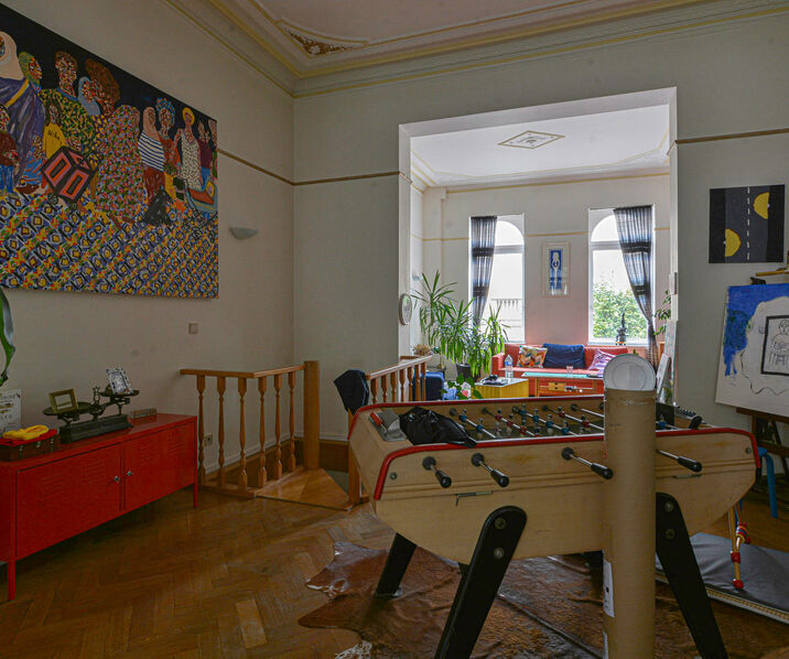 This ground-floor +/- 138m² apartment (reversed duplex) in a small building with 4 floors is composed as follows: