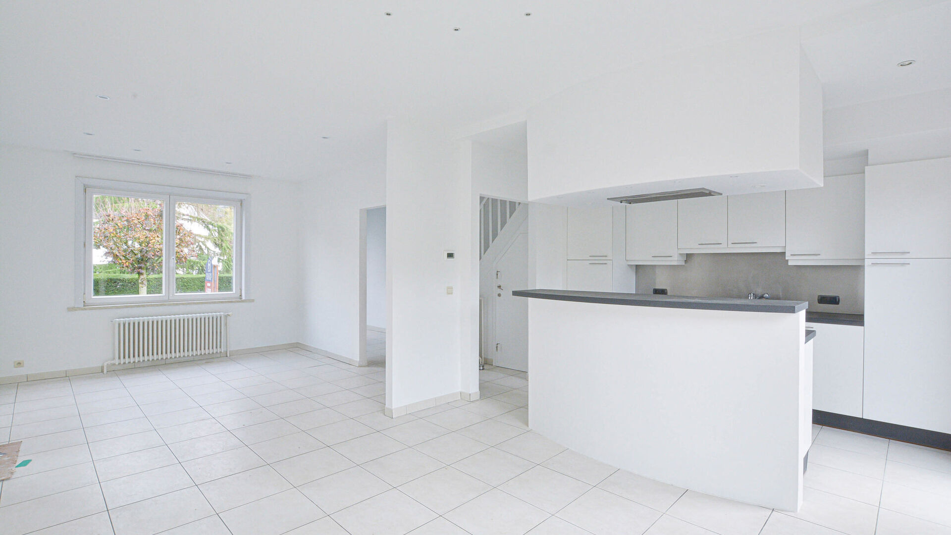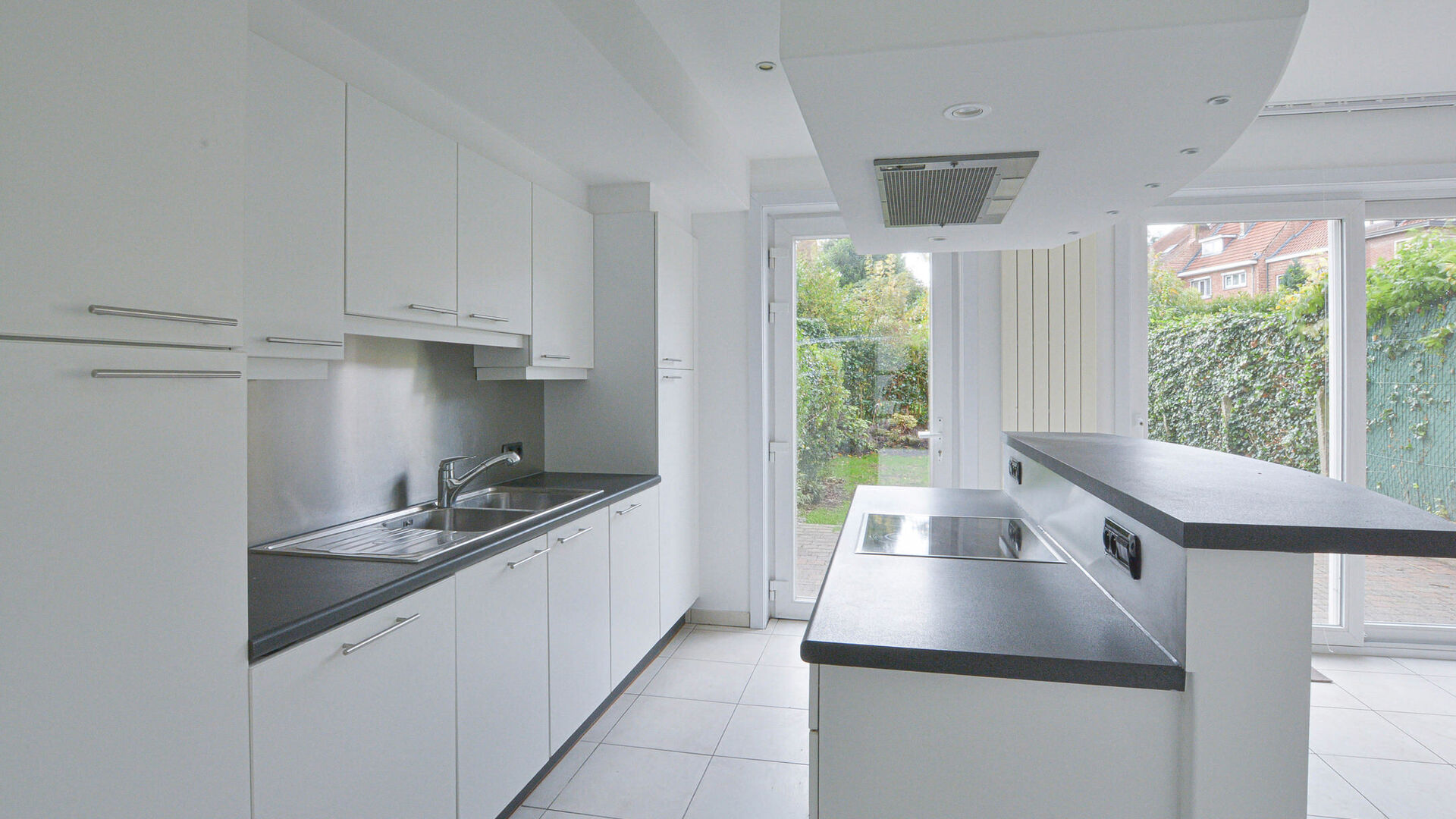 Entrance hall with separate toilet // bright living-dining room +/- 30m² with acces to OUEST facing terrace/garden // fully equipped USA kitchen (cooker, extraction, fridge/freezer, dishwasher, oven, ...) // 1st floor: 2 bedrooms, 1 with dressing // bathroom (bathtub, double sink, toilet) // study +/- 4m² // 2nd floor: master bedroom +/- 15m² // shower room with shower, sink and incorporate cupboards // separate toilet // cellar with laundy space // garage with remote control and parking before the house //