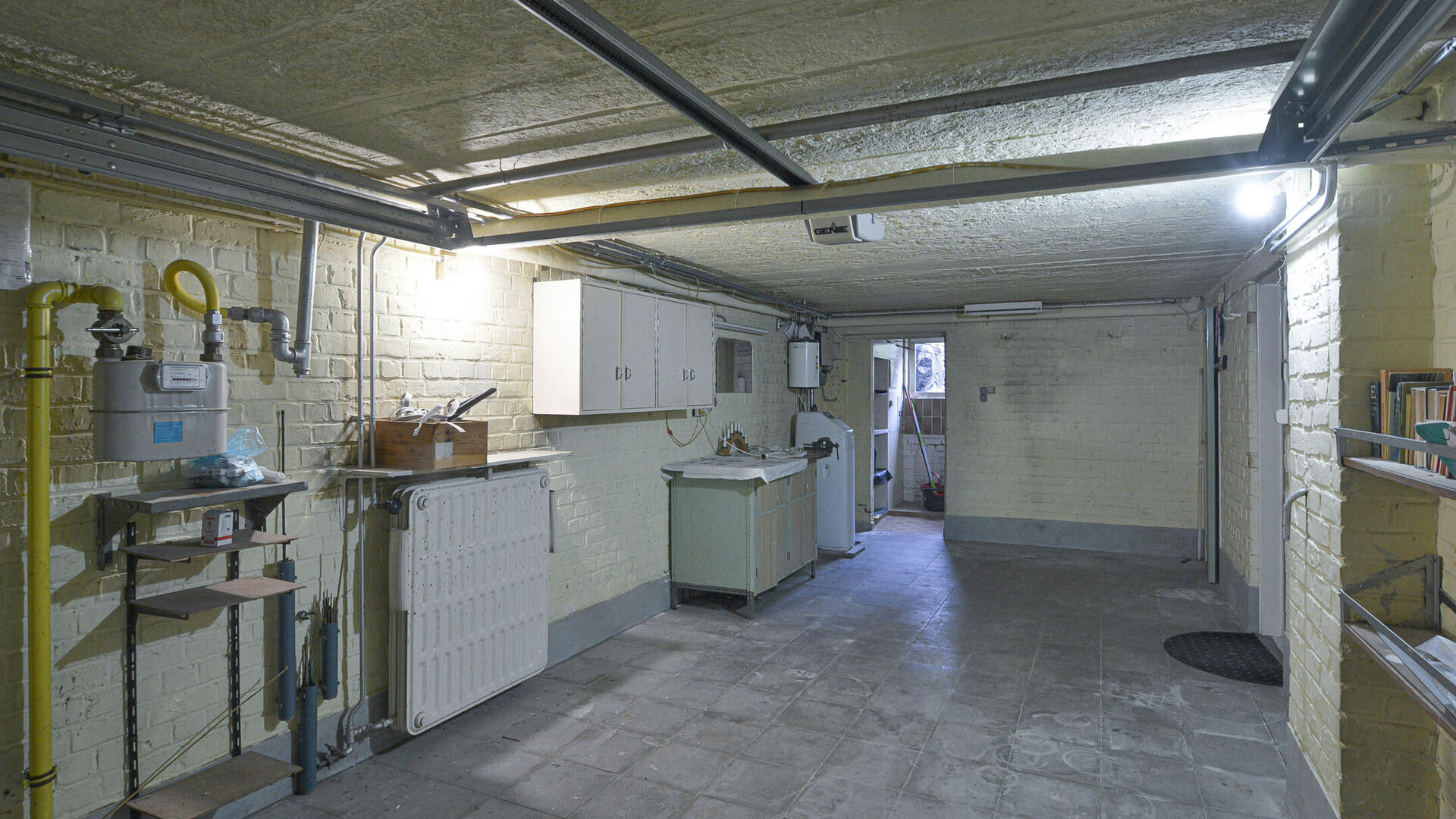 Ground floor: Entrance hall, storage cellar with laundry area, as well as a one-car garage and an outdoor parking space on the driveway.