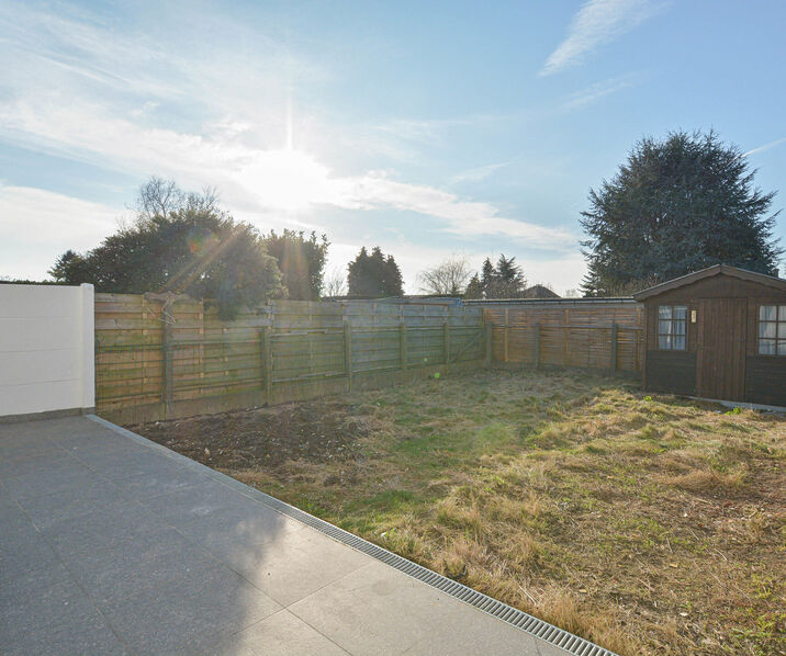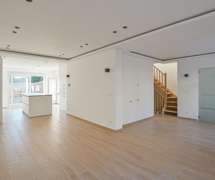 - Ground floor: entrance hall with built-in cloakroom, spacious living and dining room of +/-37 m², beautiful fully equipped open kitchen with central cooking island and access to the garden with adjoining terrace and garden shed. There is also a separate toilet, a first bedroom of +/-14 m², and a bathroom with walk-in shower and sink.