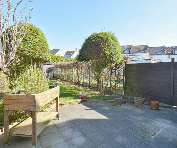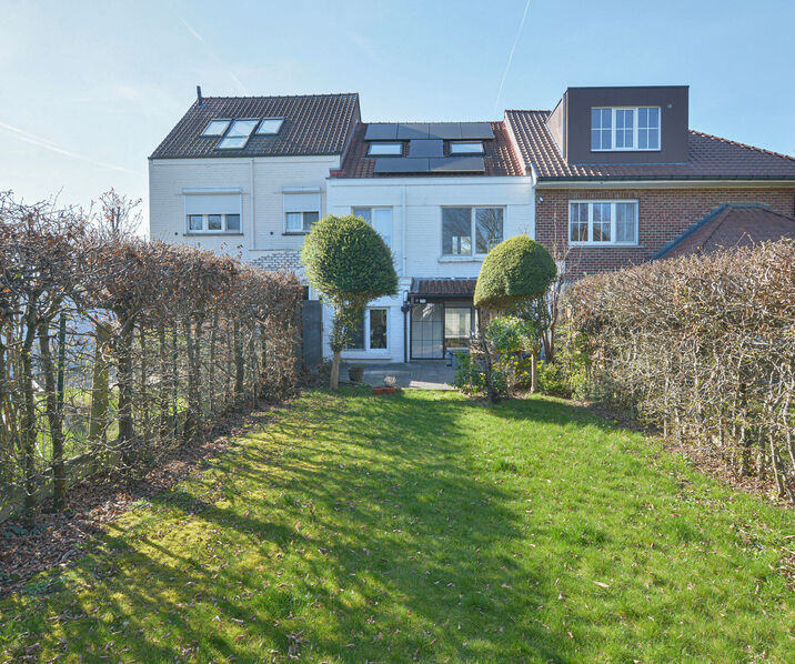 - Ground floor: Entrance hall with separate toilet, bright living and dining room of +/-30 m², equipped kitchen with direct access to a pleasant private terrace and an adjoining garden with garden shed.