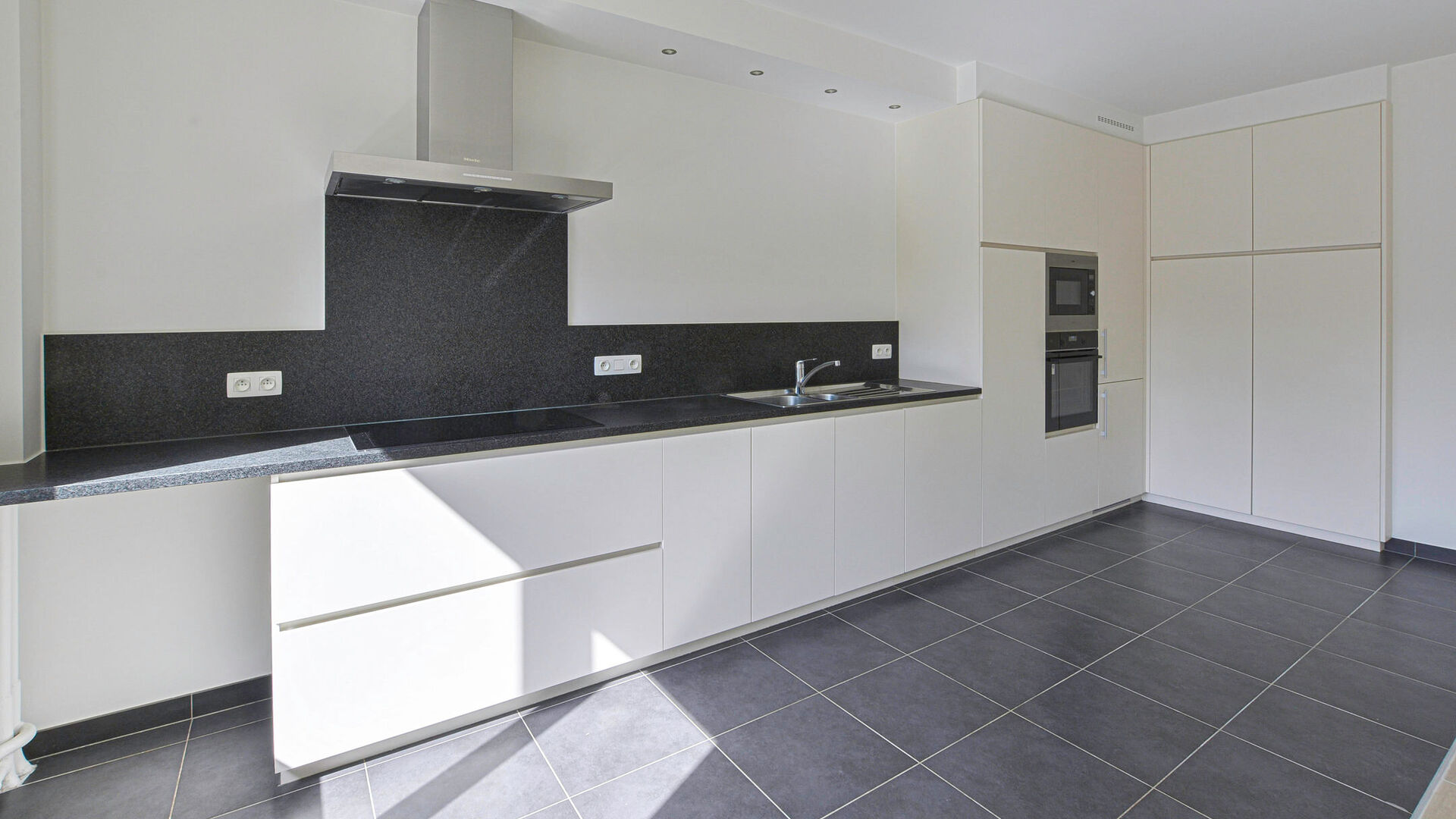 Upstairs, you will discover a beautiful fully renovated apartment of approximately 98 m². It features an entrance hall with a built-in closet and separate toilet, a bright living room with a fully equipped open kitchen (induction hob, oven, microwave, fridge, freezer, dishwasher) of approximately 30 m², two bedrooms with built-in wardrobes (±12.6 m² and ±18 m²), as well as a modern shower room with one sink.