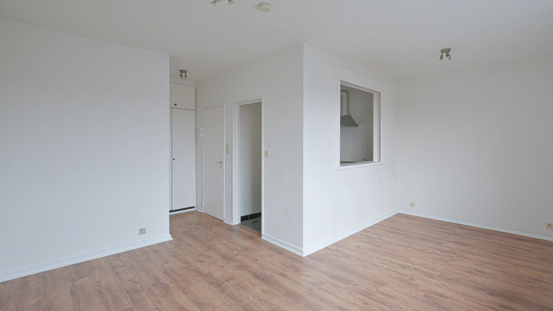 An entrance hall with a built-in wardrobe, bathroom (shower, toilet, and sink), kitchen (cooker, refrigerator and dishwasher), and a bright living/sleeping area of +/- 16m².