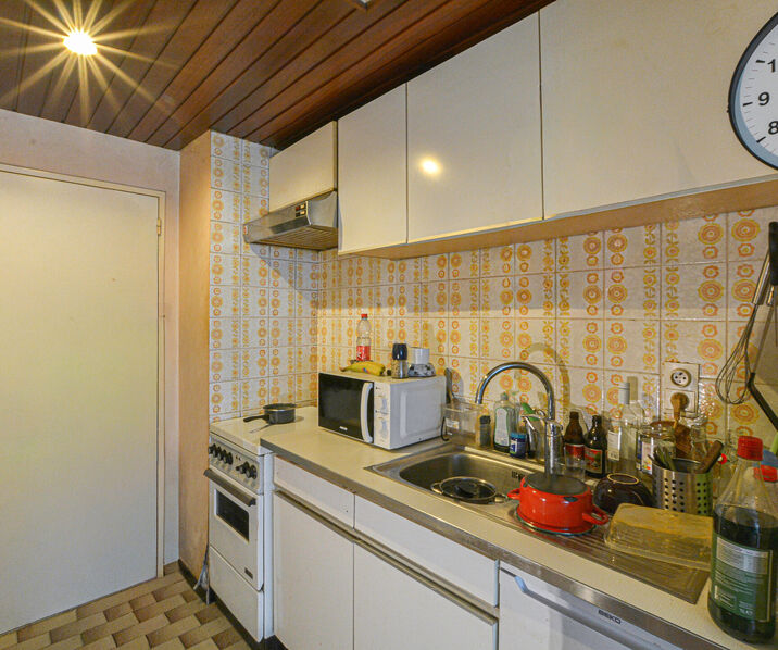 Kitchen (fridge, hob) // living area +/- 16,5m² // bathroom with small bath, WC and sink.