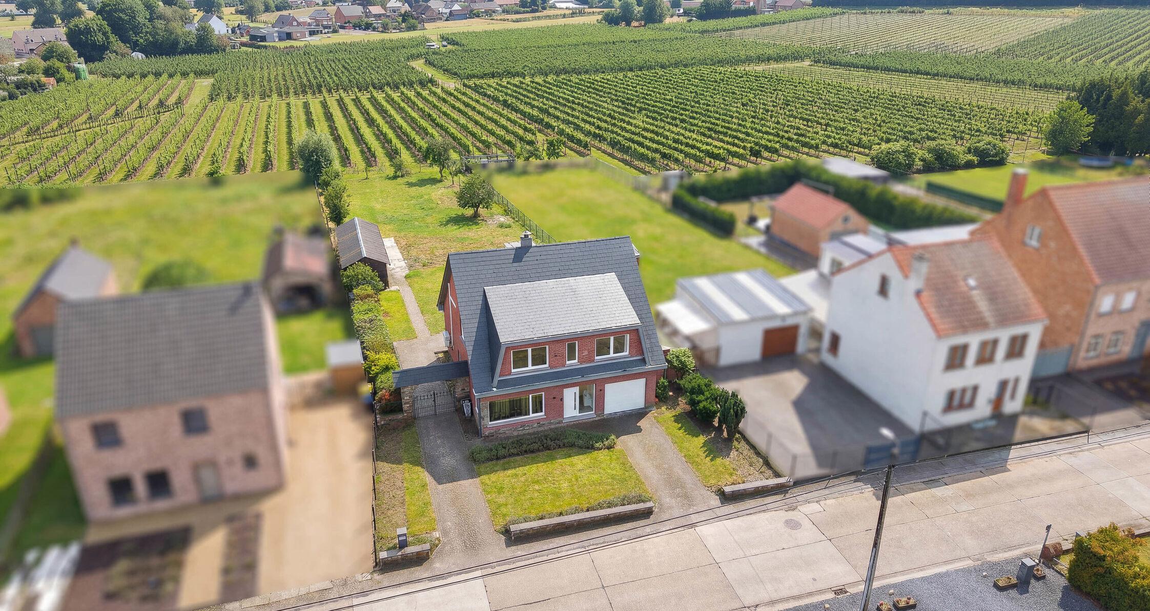 -Ground floor: Entrance hall with guest toilet and space for a wardrobe, large living and dining room of +/- 40 m² with a pellet stove, giving access to a large southwest-facing terrace. The adjoining garden of +/- 900 m² includes a garden house. Fully equipped open kitchen with central cooking island. The ground floor also includes a garage for one car, two outdoor parking spaces, a laundry room, and a storage area.