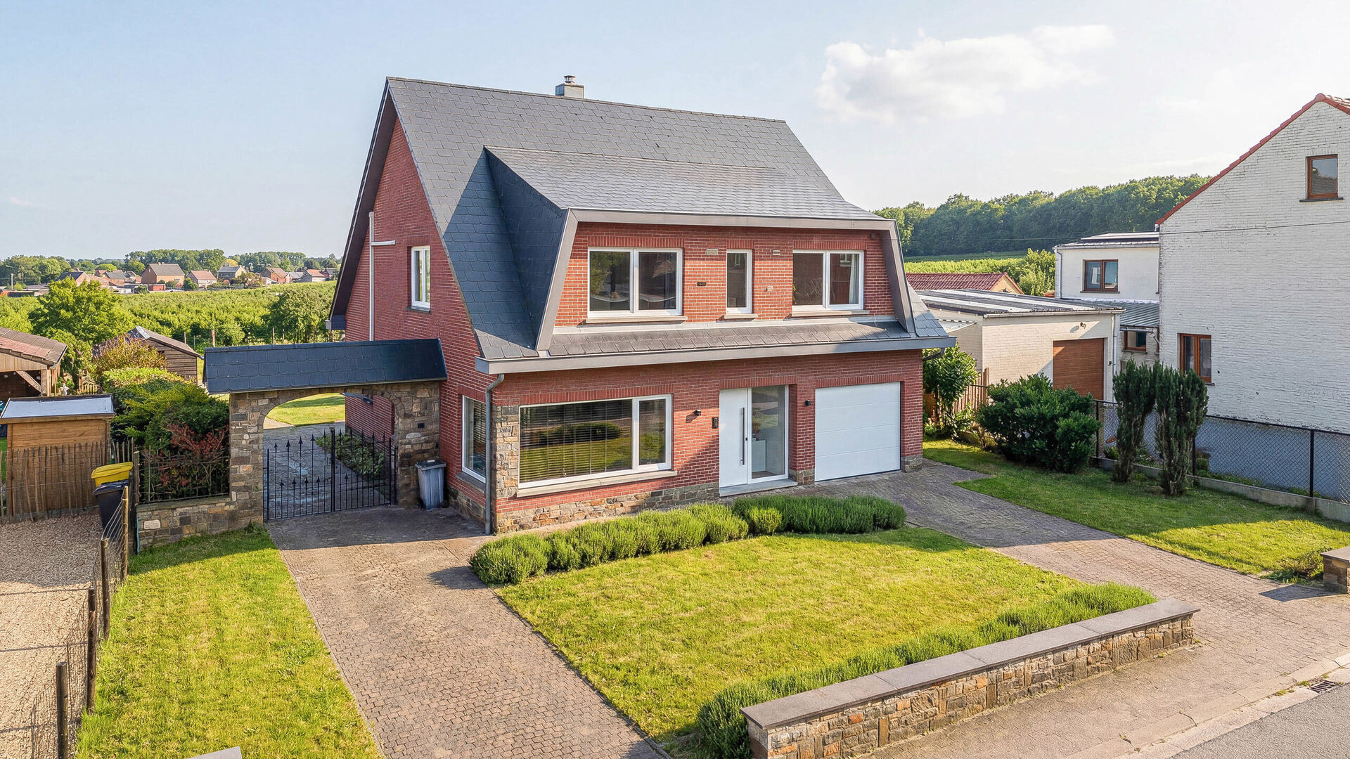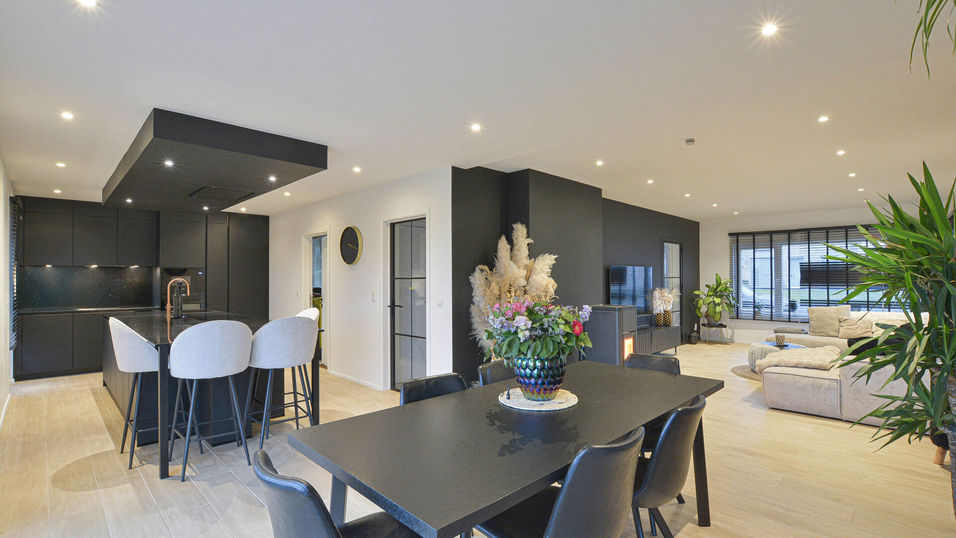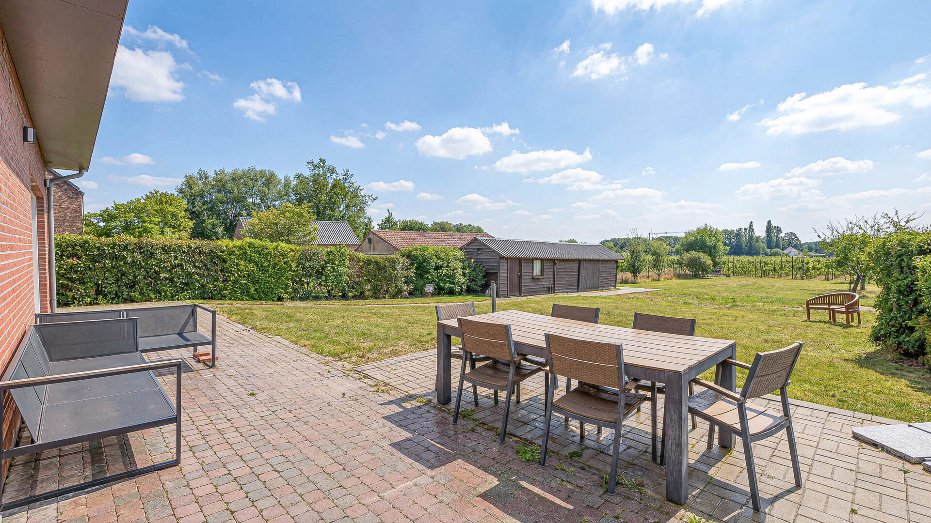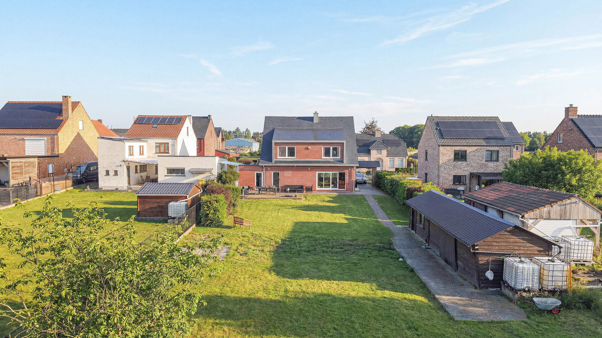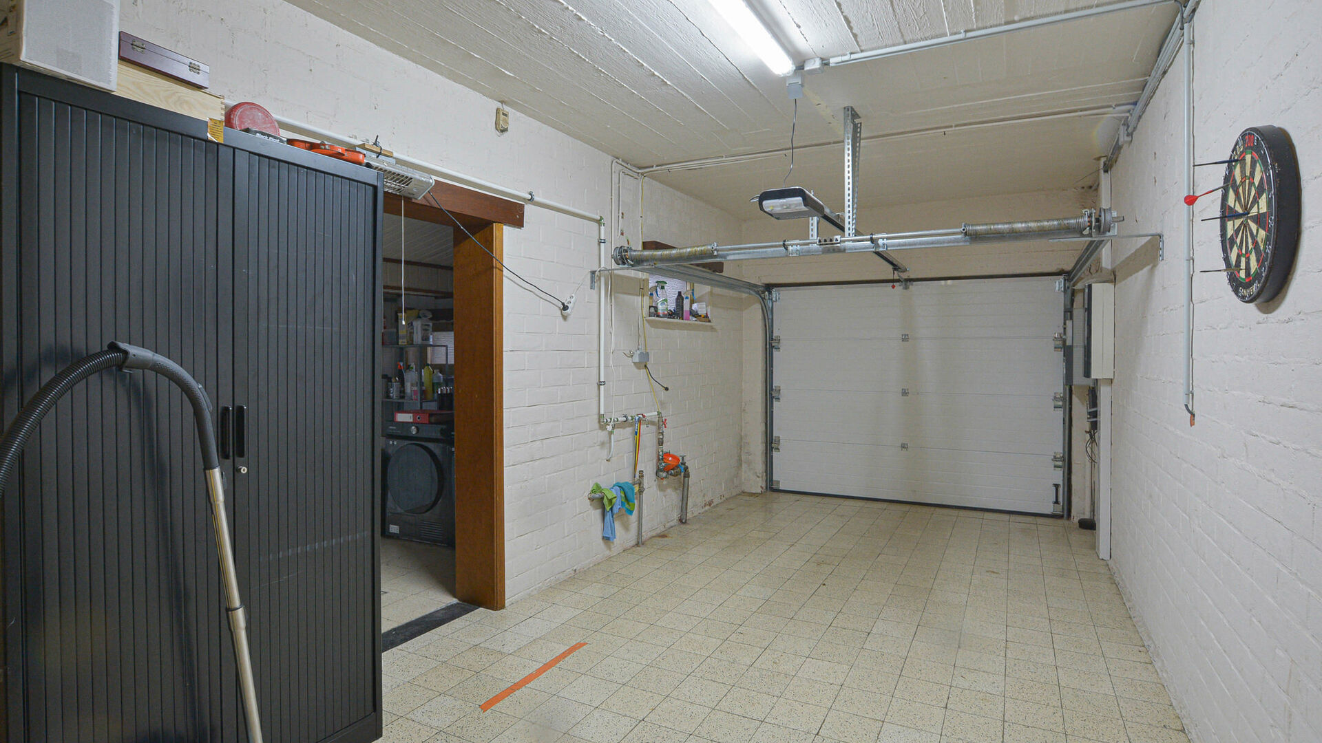 -Ground floor: Entrance hall with guest toilet and space for a wardrobe, large living and dining room of +/- 40 m² with a pellet stove, giving access to a large southwest-facing terrace. The adjoining garden of +/- 900 m² includes a garden house. Fully equipped open kitchen with central cooking island. The ground floor also includes a garage for one car, two outdoor parking spaces, a laundry room, and a storage area.