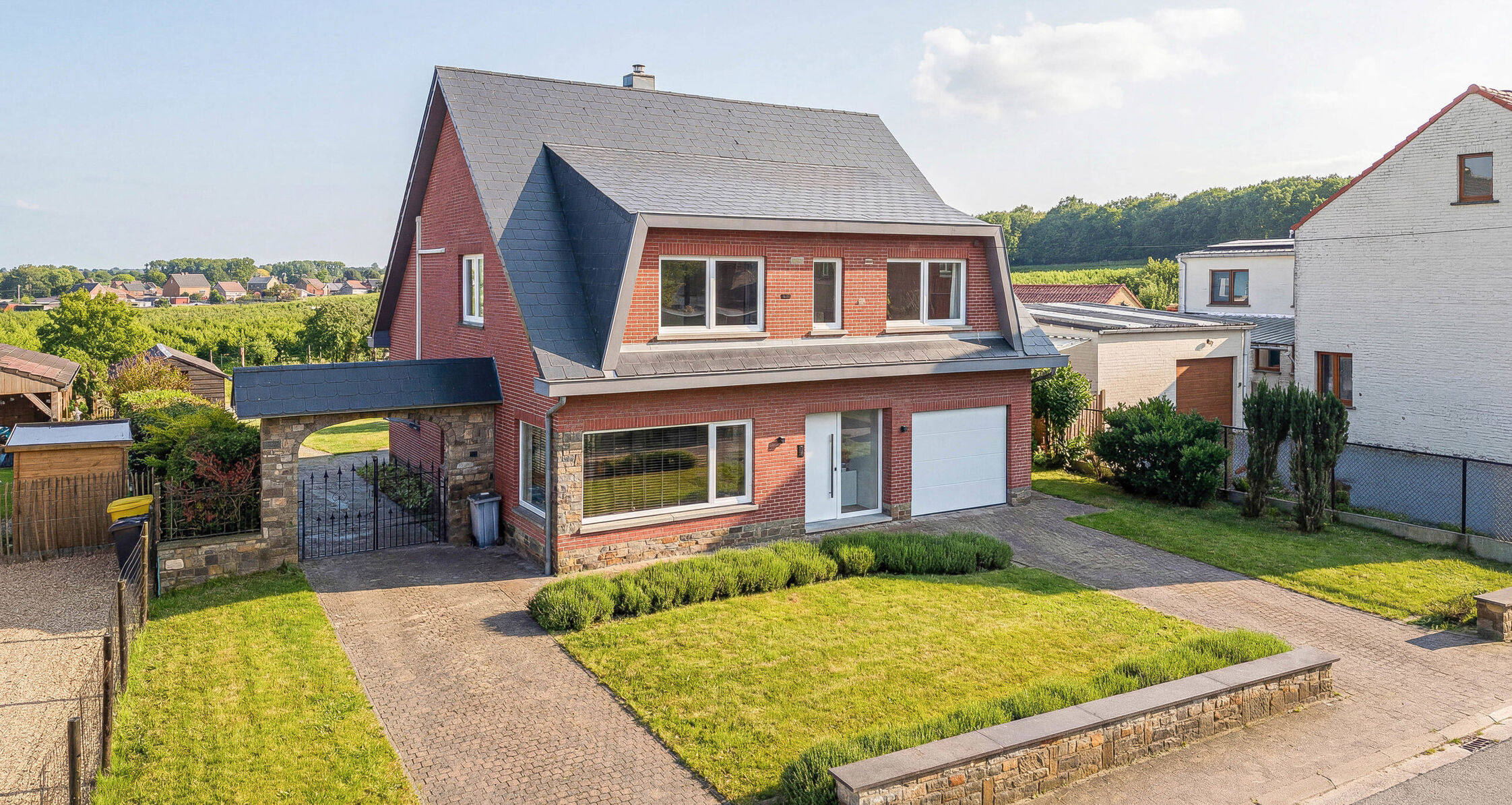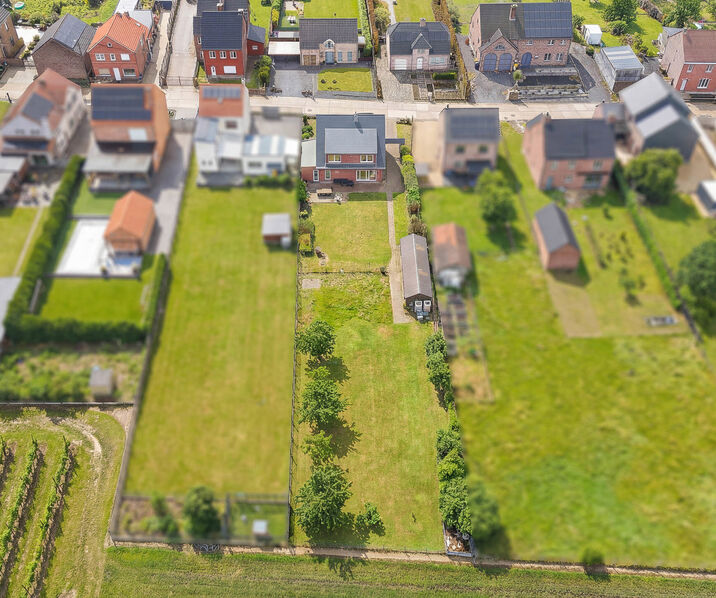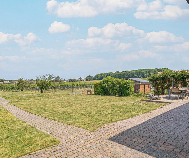 -Ground floor: Entrance hall with guest toilet and space for a wardrobe, large living and dining room of +/- 40 m² with a pellet stove, giving access to a large southwest-facing terrace. The adjoining garden of +/- 900 m² includes a garden house. Fully equipped open kitchen with central cooking island. The ground floor also includes a garage for one car, two outdoor parking spaces, a laundry room, and a storage area.