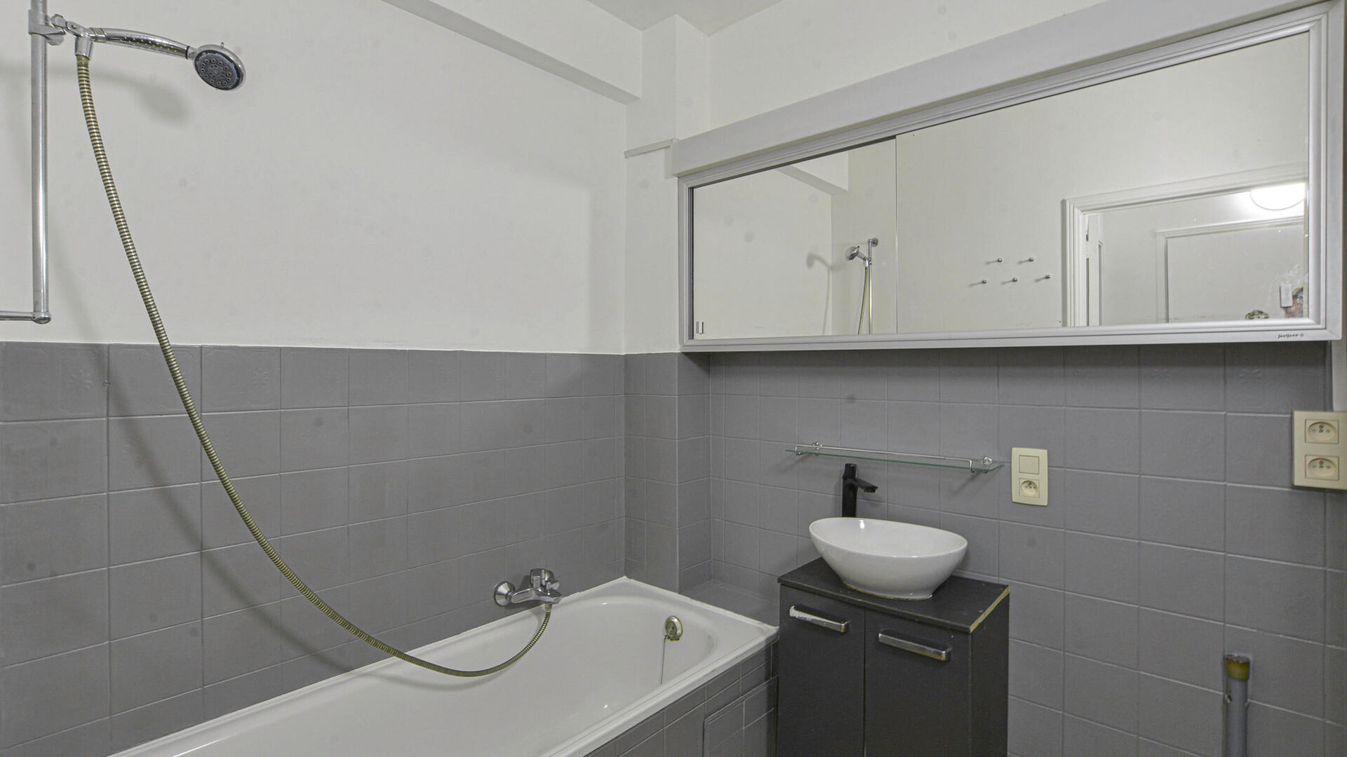 Hall d'entrée avec vestiaire // séjour lumineux +/-26m² // cuisine non équipée (seulement taques au gaz) // hall de nuit avec WC séparé et débarras // 2 chambres à coucher +/- 9m² et 14m² dont la plus grande donne accès au balcon // salle de bain (baignoire, évier, et emplacement machine à laver).