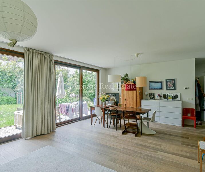 Hall d'entrée avec WC, grand et lumineux séjour, cuisine américaine super-équipée, buanderie, hall de nuit, 2 chambres (14 et 11m²), salle de bain ( baignoire, douche, double évier), terrasse, grand jardin (+/- 110m²), cave.