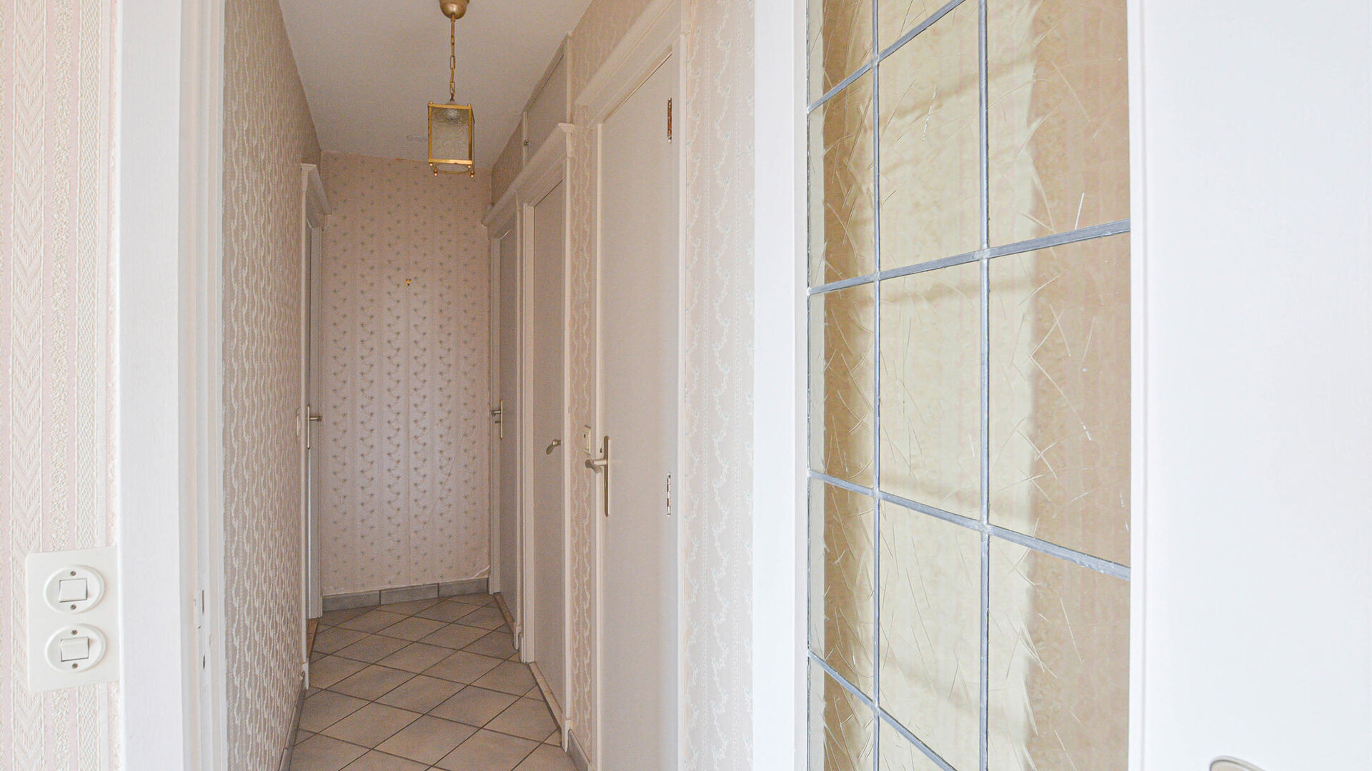 Hall d'entrée avec placards et espace vestiaire // séjour lumineux +/- 30m² donnant accès à la terrasse orientée EST // cuisine séparée // hall de nuit avec WC séparé // 2 chambres à coucher +/- 12,8-9,2m² dont la plus grande donnant accès à la terrasse // salle de bain avec baignoire et évier //une cave // un emplacement de parking intérieur/garage.
