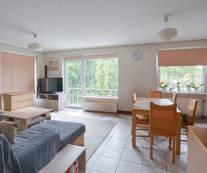 Hall d’entrée, lumineux séjour-salle à manger de +/- 25m² avec terrasse et vue sur le parc, cuisine entièrement équipée (taque de cuisson, four, lave-vaisselle, réfrigérateur/congélateur,…), hall de nuit avec vestiaire, WC séparé et buanderie. Trois chambres (14m² – 10m² – 7m²) dont une donnant accès à la terrasse orientée Sud de +/- 6m², salle de bains avec lavabo et baignoire.