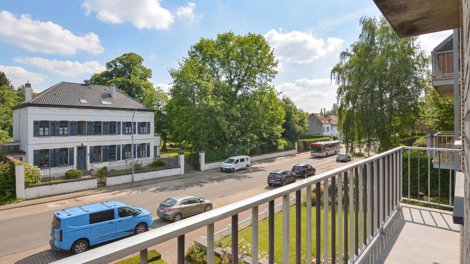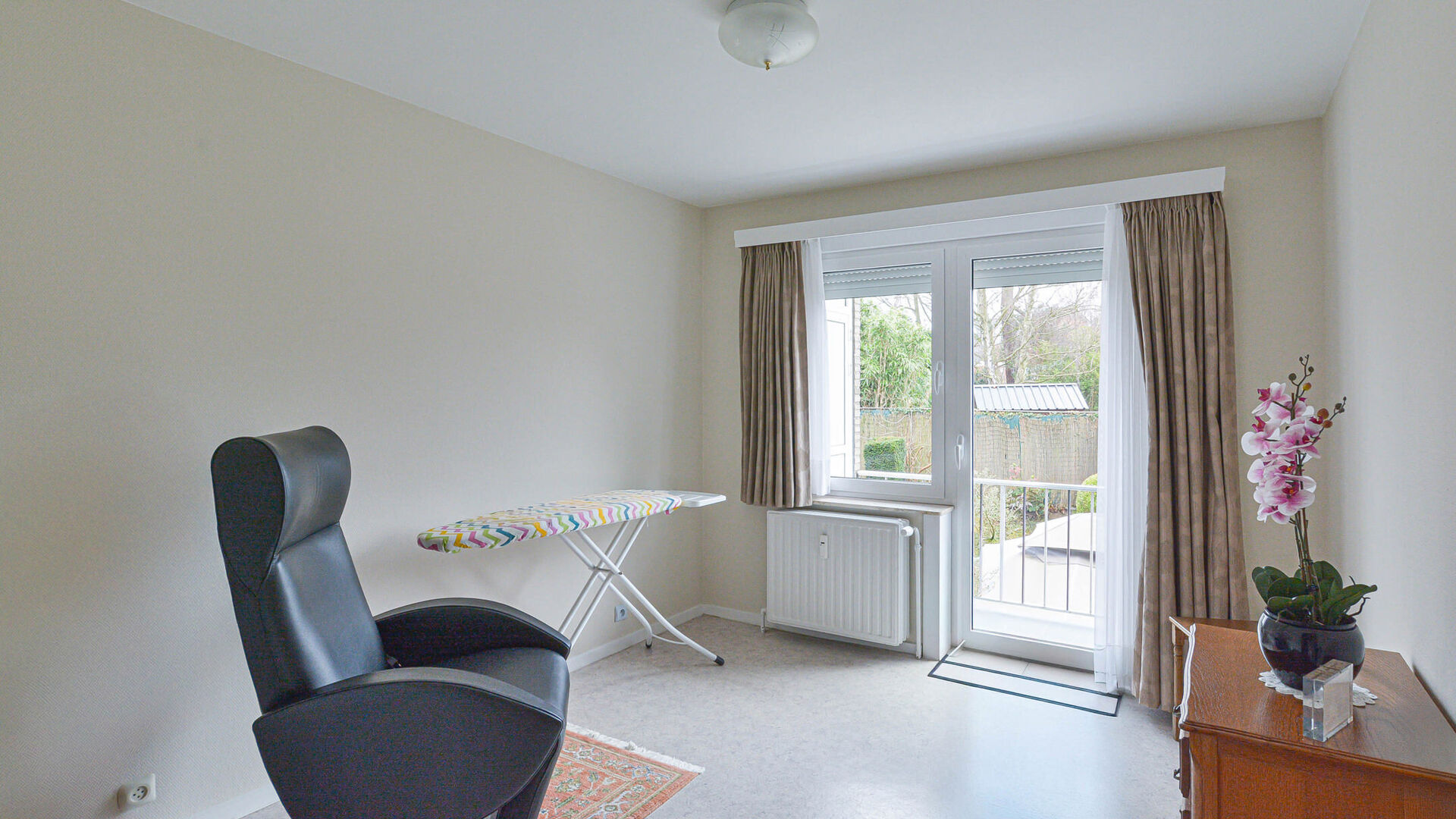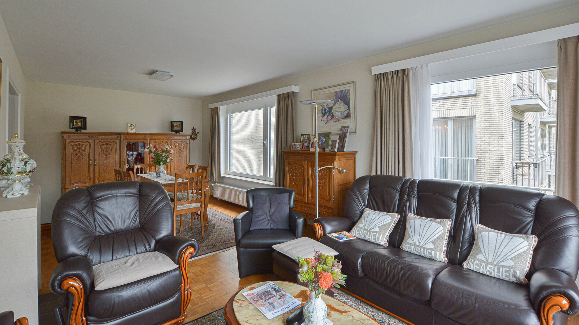 Hall d’entrée, lumineux séjour/salle à manger de +/-30m² donnant accès à une terrasse avant, cuisine entièrement équipée (plaque de cuisson, four, lave-vaisselle, réfrigérateur/congélateur, emplacement pour machine à laver...). Hall de nuit avec WC séparé, vestiaire et débarras. Deux chambres de +/-15m² et +/-11m², la plus petite donnant accès à une terrasse orientée Sud de +/-6m², salle de bains avec baignoire et évier. Une cave et un garage box + 30.000 € sont vendus avec l’appartement. Informations complémentaires : double vitrage, chauffage central au mazout, parlophone, porte sécurisée, actuellement loué.