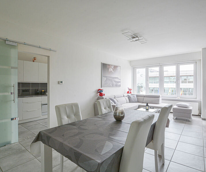 Ce bel appartement entièrement rénové de +/-103m² (selon PEB) se trouve au 2ᵉ et dernier étage d’une petite copropriété sans ascenseur. Il se compose comme suit : Hall d’entrée avec WC séparé, Lumineux séjour–salle à manger de ±27 m², Cuisine entièrement équipée avec raccordements pour machine à laver et sèche-linge, Deux belles chambres de ±15 m² et ±13 m², toutes deux donnant accès à une terrasse de ±5 m², Dressing, Salle de bains avec douche à l’italienne et évier. Une cave privative complète ce bien.