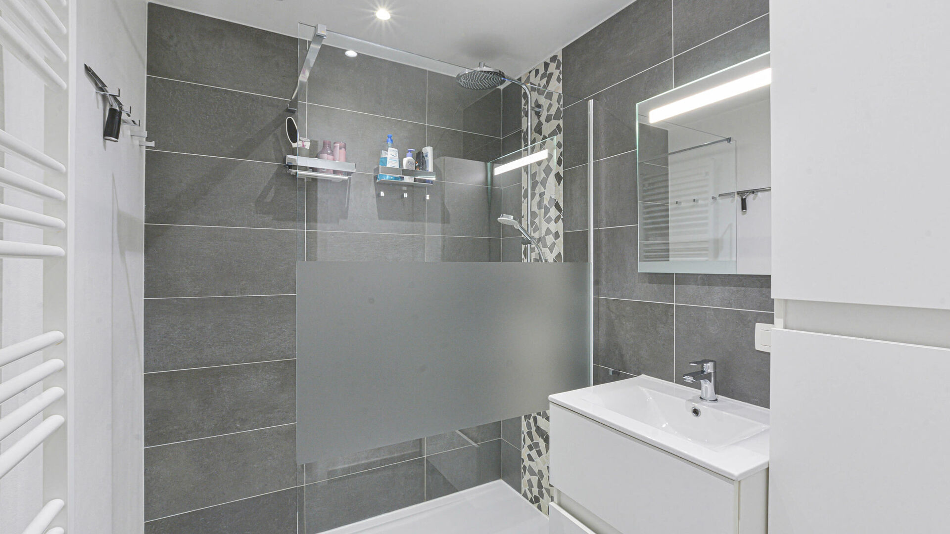 - Salle de bains avec douche à l’italienne et évier.