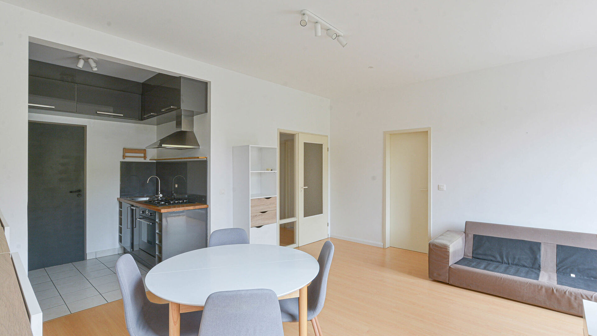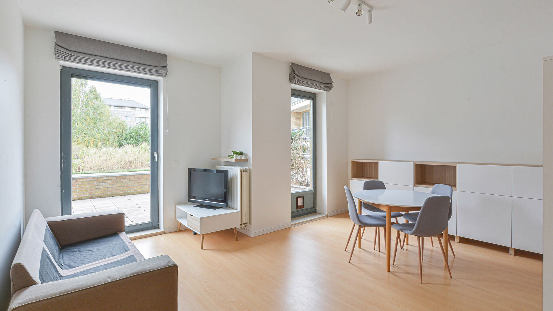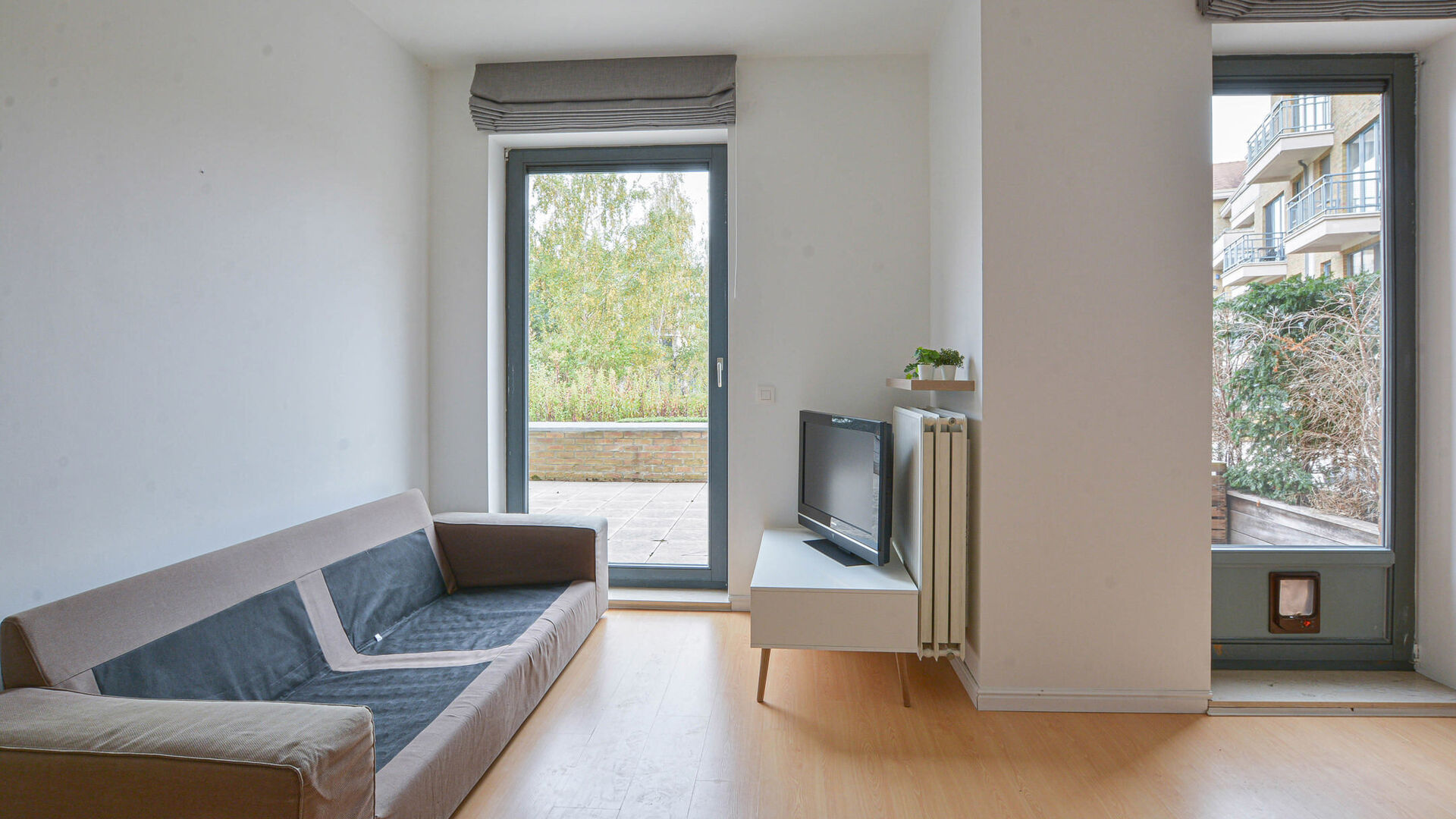 Hall d’entrée avec vestiaire intégré et toilette séparée, salle de bain avec baignoire et lévier, lumineux séjour-salle à manger de ±21 m² donnant accès à une spacieuse terrasse, cuisine entièrement équipée avec coin débarras/local technique et la chambre à coucher de ±14 m².