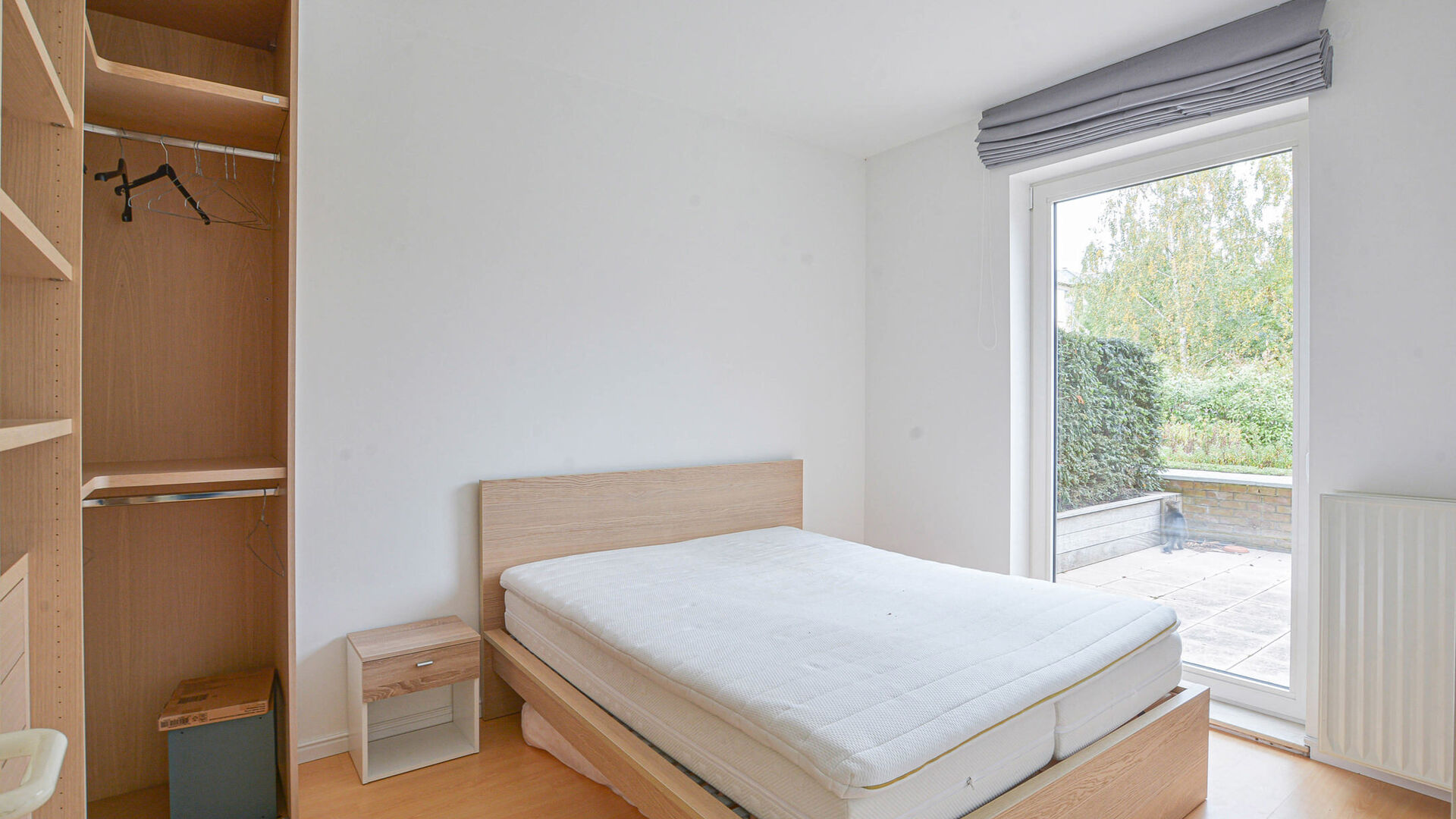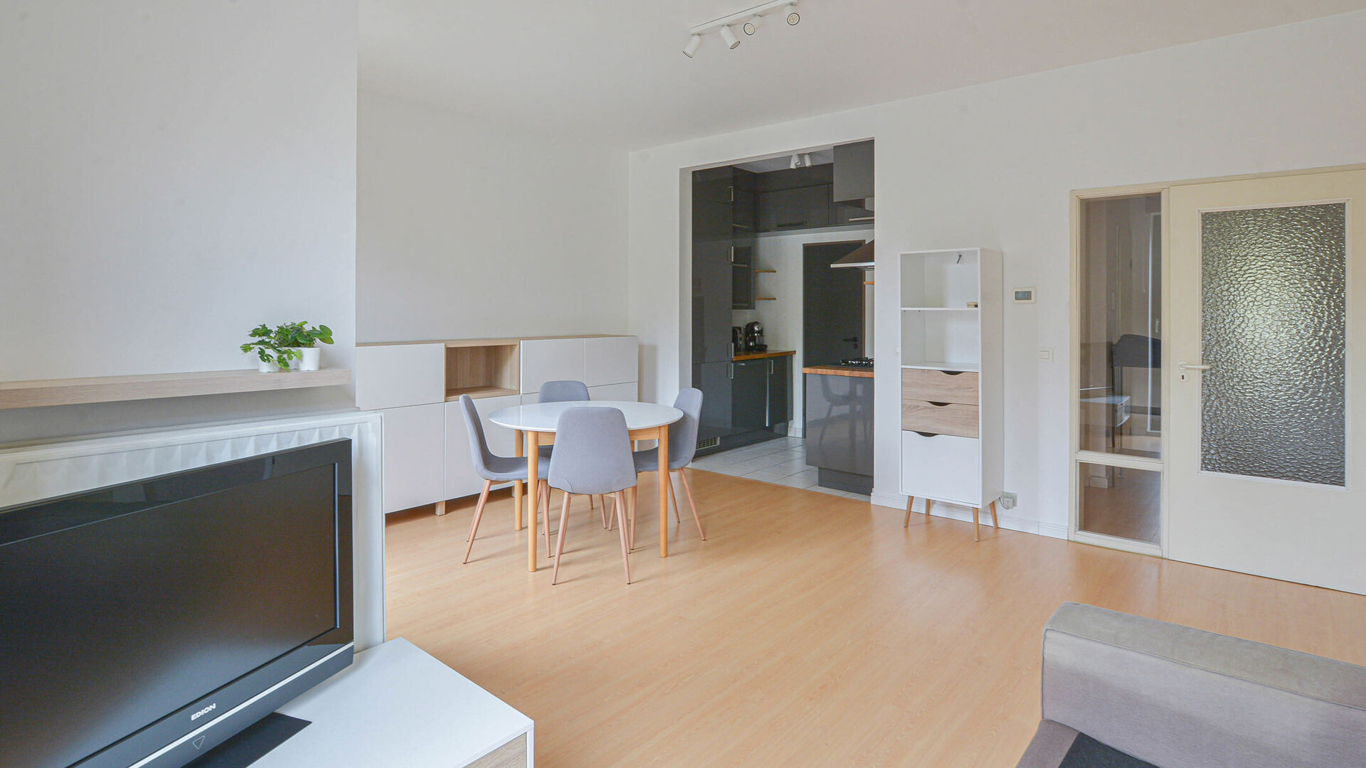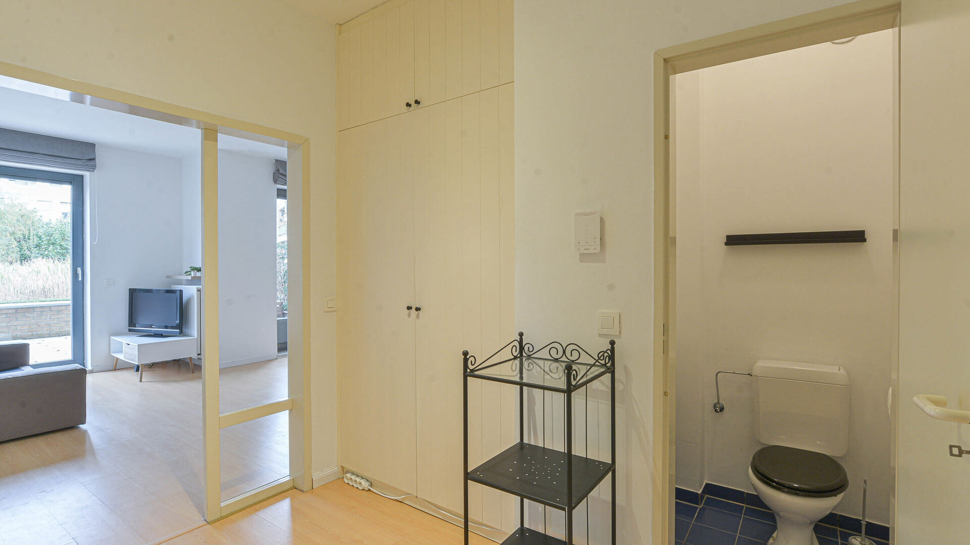 Hall d’entrée avec vestiaire intégré et toilette séparée, salle de bain avec baignoire et lévier, lumineux séjour-salle à manger de ±21 m² donnant accès à une spacieuse terrasse, cuisine entièrement équipée avec coin débarras/local technique et la chambre à coucher de ±14 m².