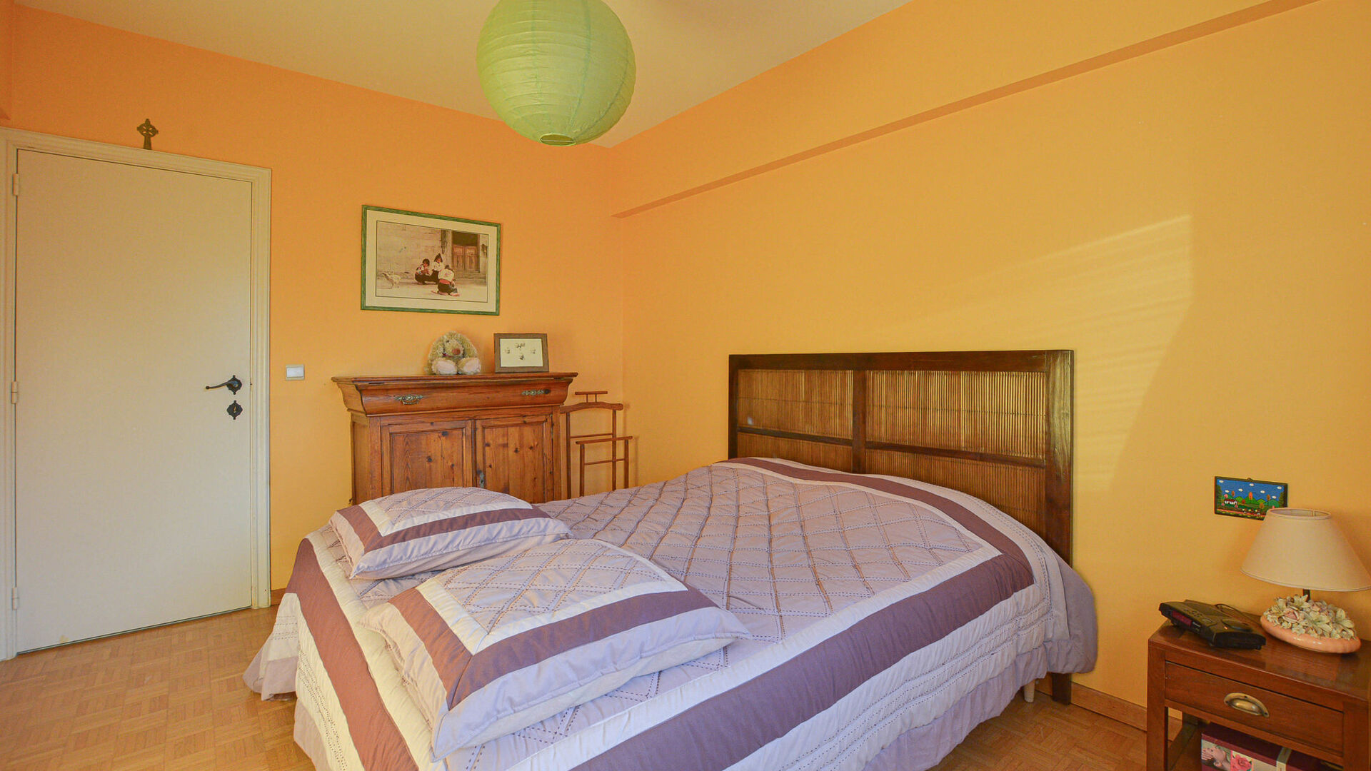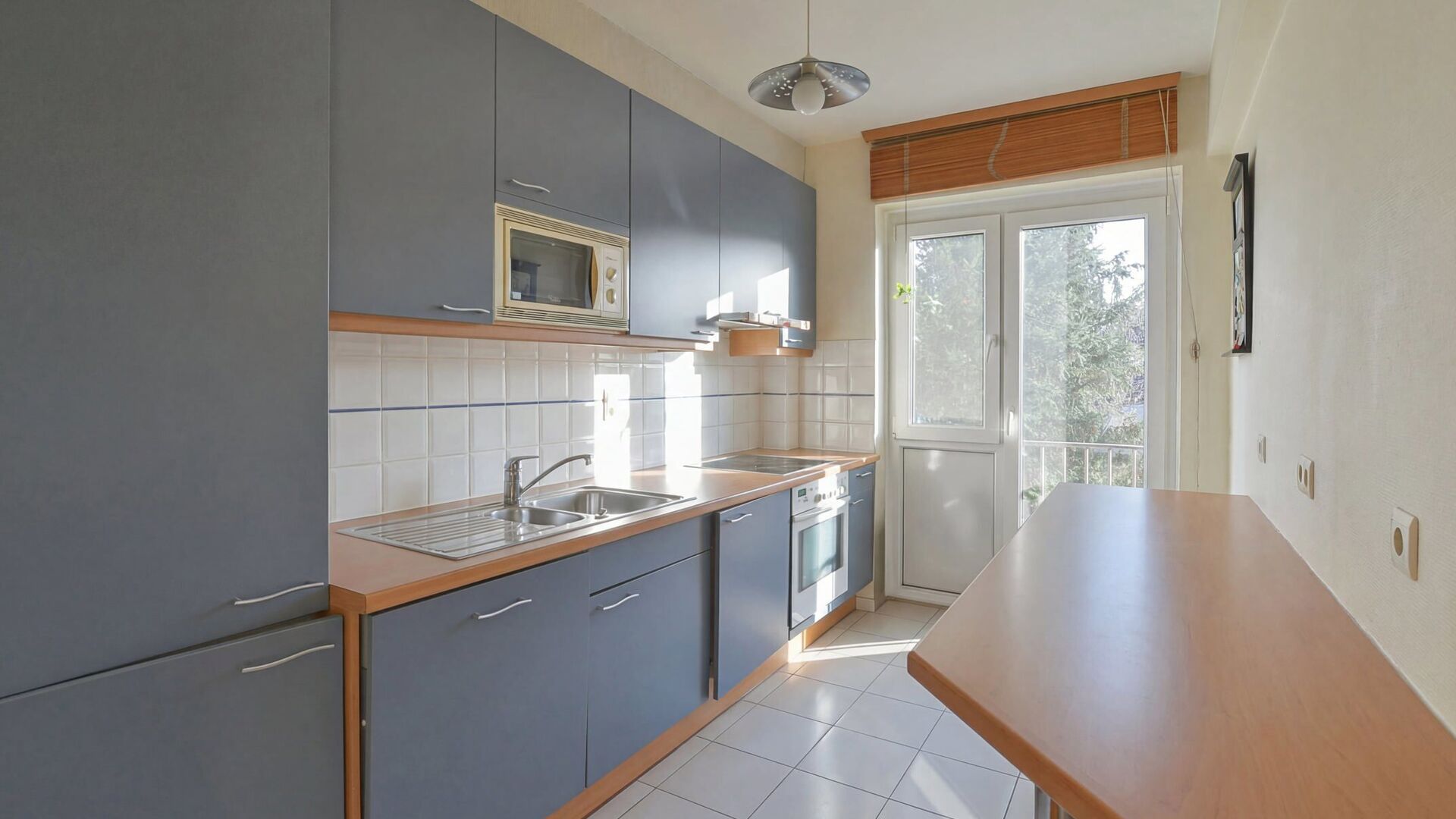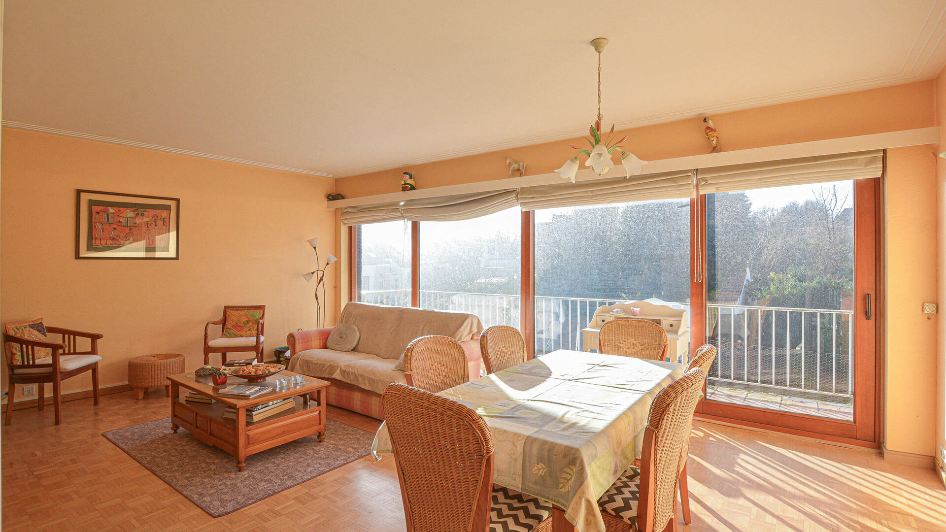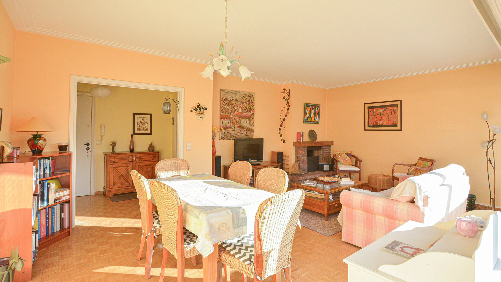 Hall d’entrée avec espace pour une armoire vestiaire, lumineux séjour-salle à manger de +/-27m² donnant accès à une terrasse orientée plein sud , cuisine entièrement équipée avec petit balcon (par exemple pour les sacs-poubelle). Hall de nuit avec débarras et toilette séparée , 2 belles chambres à coucher de +/- 12 m² et salle de bains avec baignoire et double évier.
