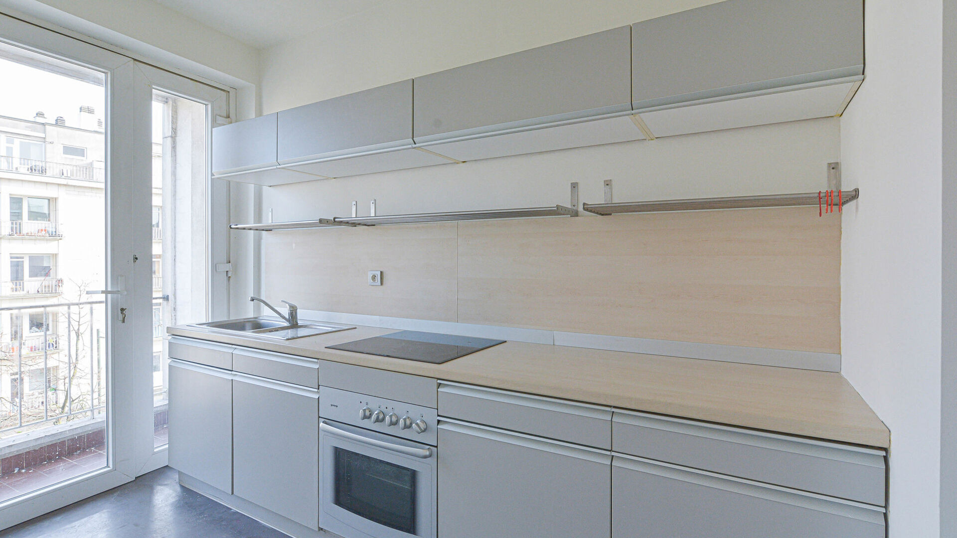 Hall d’entrée ±4 m² avec toilette séparée // séjour lumineux ±25,5 m² donnant accès à la cuisine fermée ±6 m² (équipée d’une plaque à induction, four, lave-vaisselle) avec espace de rangement et placards intégrés, et accès à un balcon orienté est // deux chambres : première chambre ±12 m² accessible par le hall de nuit, seconde chambre ±10m² accessible depuis le séjour // salle de bains avec baignoire, lavabo et raccordement pour machine à laver //
