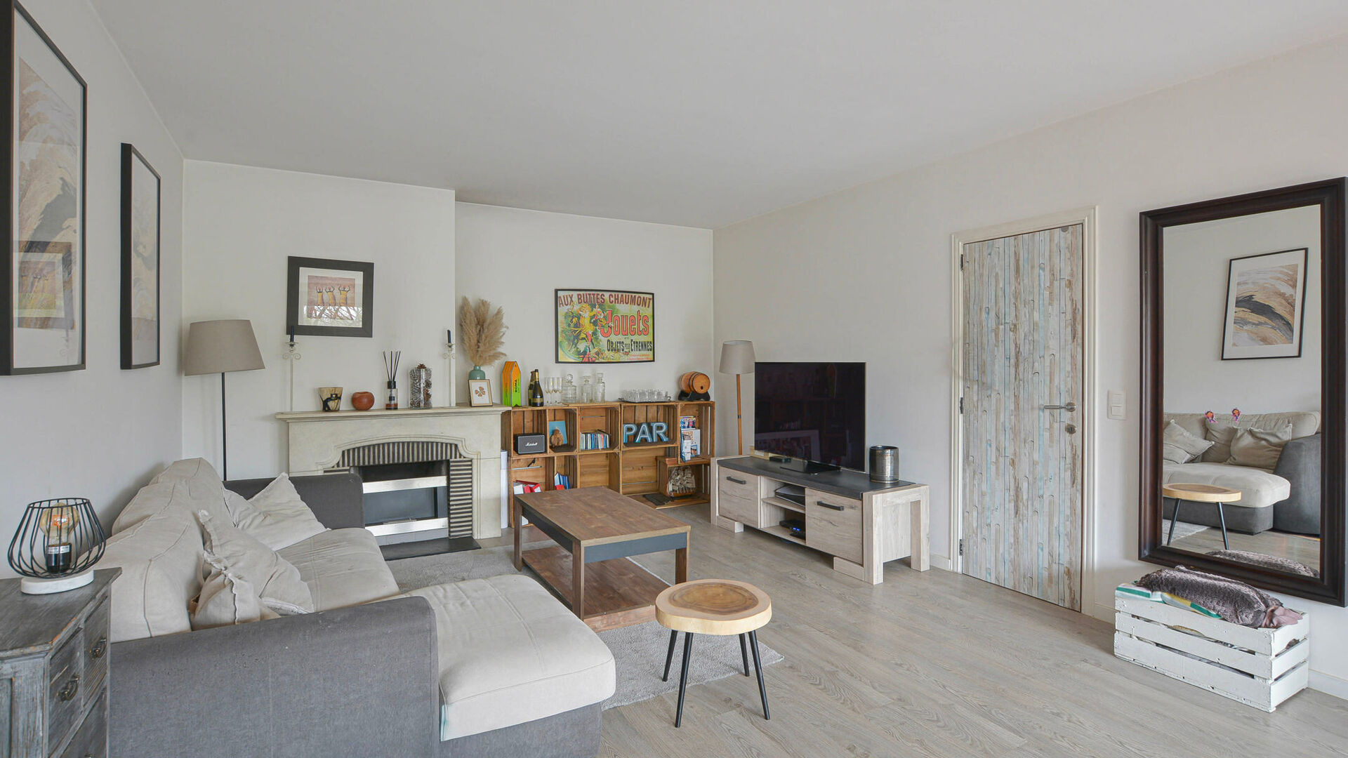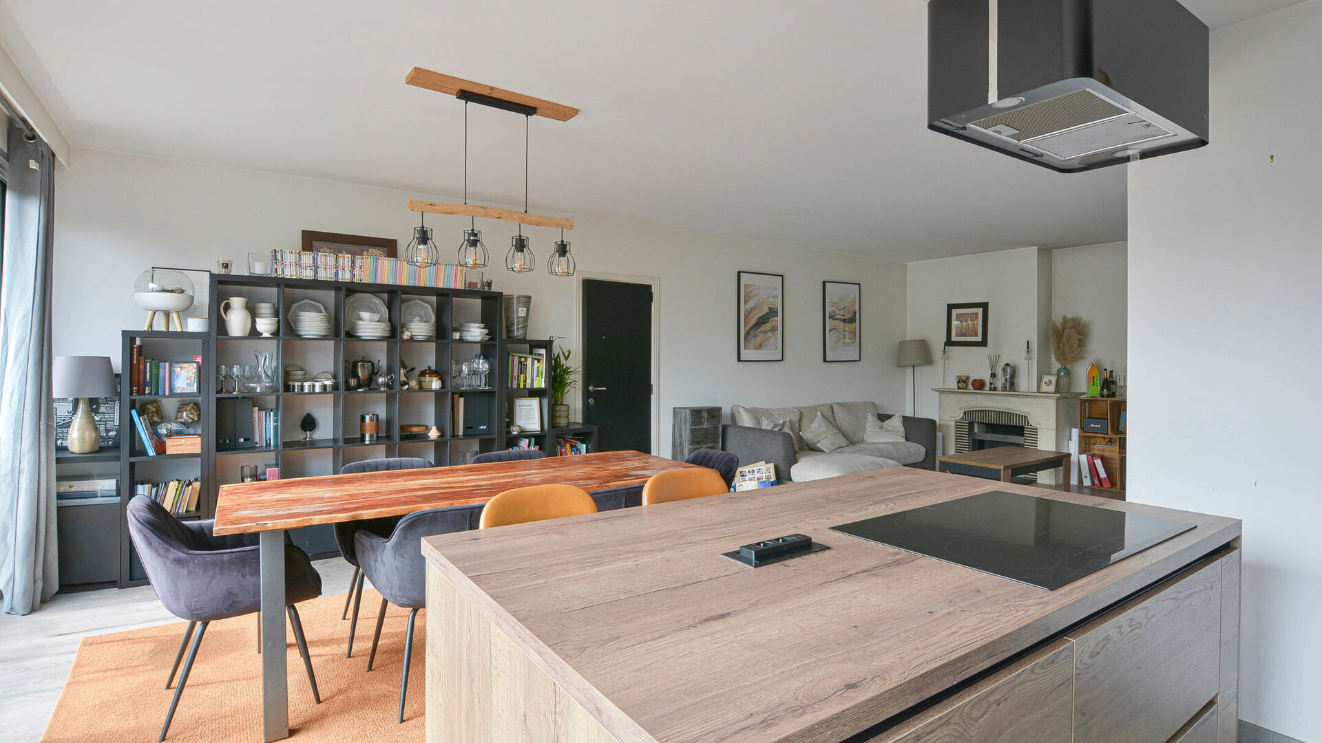 Hall d’entrée avec vestiaire et débarras avec raccordements pour machine à laver/sèche-linge. Lumineux séjour-salle à manger de 36m² donnant accès à une terrasse orientée sud, cuisine ouverte entièrement équipée avec îlot central/coin petit-déjeuner. Hall de nuit avec WC, 2 chambres à coucher de +/-15 et 12m² et salle de bain avec baignoire et lavabo.