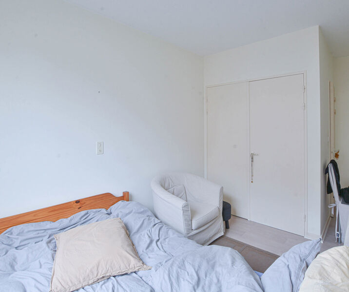 Cet appartement de +/-51m² (selon PEB), est situé au 1er étage et se compose comme suit : Hall d’entrée avec espace vestiaire et WC séparé, Séjour/salle à manger lumineux de ±19 m², Cuisine équipée (taques, four, réfrigérateur et emplacement pour machine à laver), Chambre de ±10 m² avec salle de bain attenante (baignoire avec douche et lavabo).