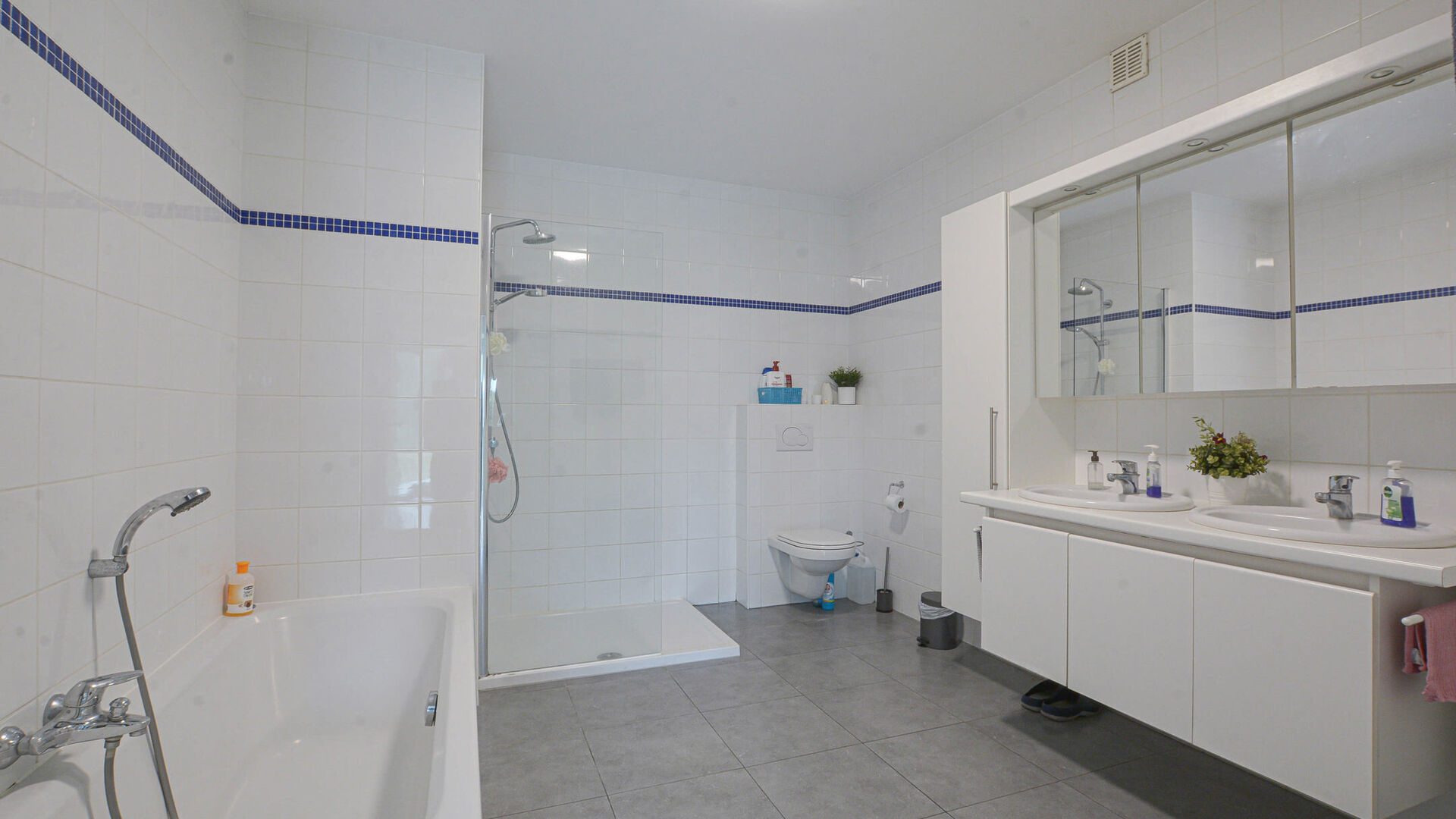 - Chambre parentale +/- 16 m² avec espace dressing et salle de bain attenante (baignoire, douche, évier et WC)