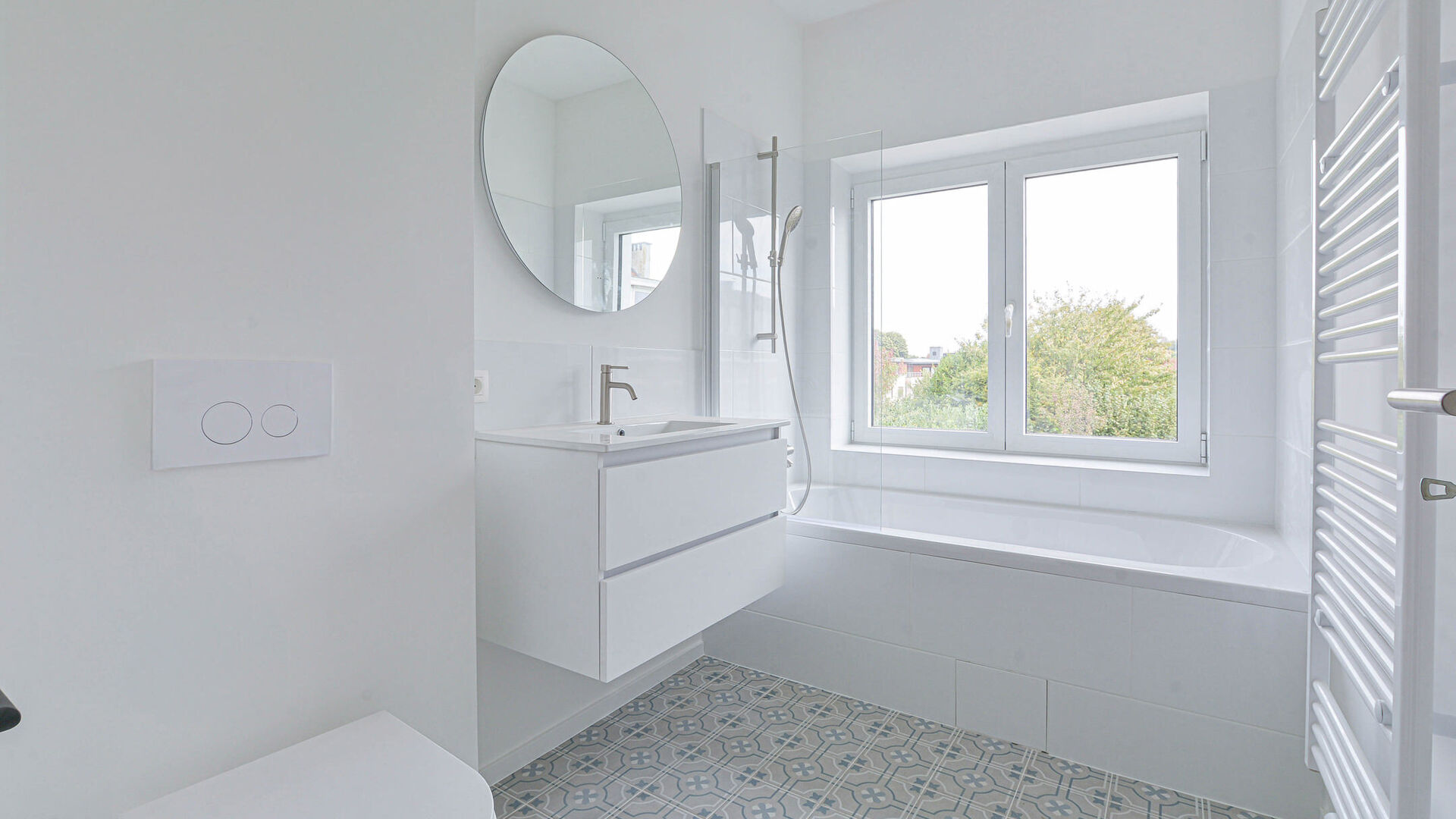 2e étage : Deux chambres d’environ 13 m², une salle de bains (baignoire, toilette, lavabo) et une salle de douche avec douche à l’italienne et lavabo.