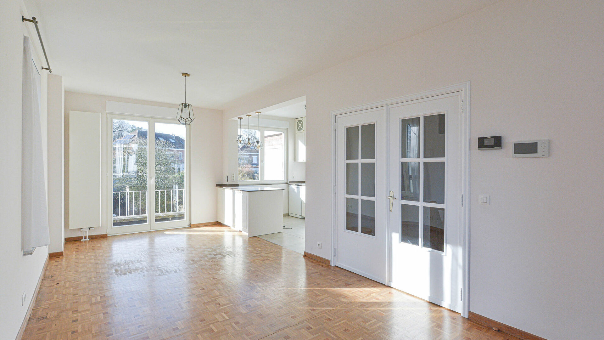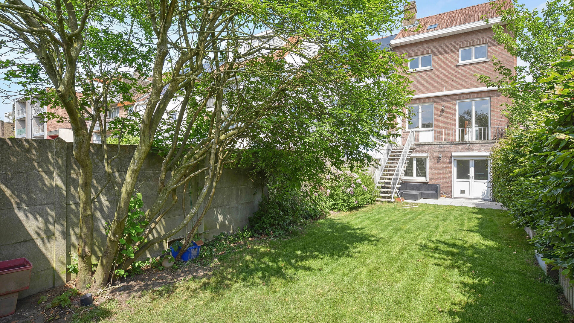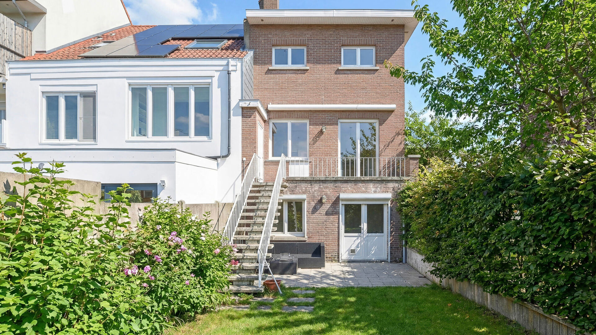 Lumineux séjour en L de +/-35 m² avec feu ouvert, cuisine ouverte super équipée avec coin à déjeuner, terrasse donnant accès au jardin orienté Sud-Ouest de +/-75 m² avec abri de jardin.
