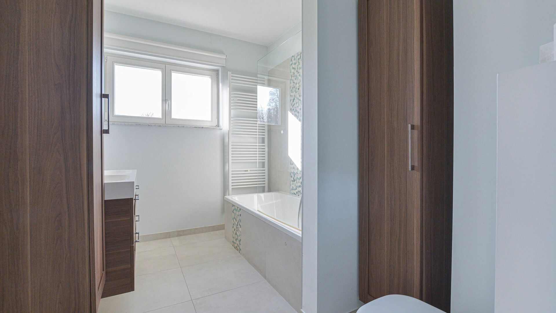 Trois chambres à coucher de +/-15-13-6m², ainsi qu’une salle de bains (baignoire avec douche, toilette et double éviers).