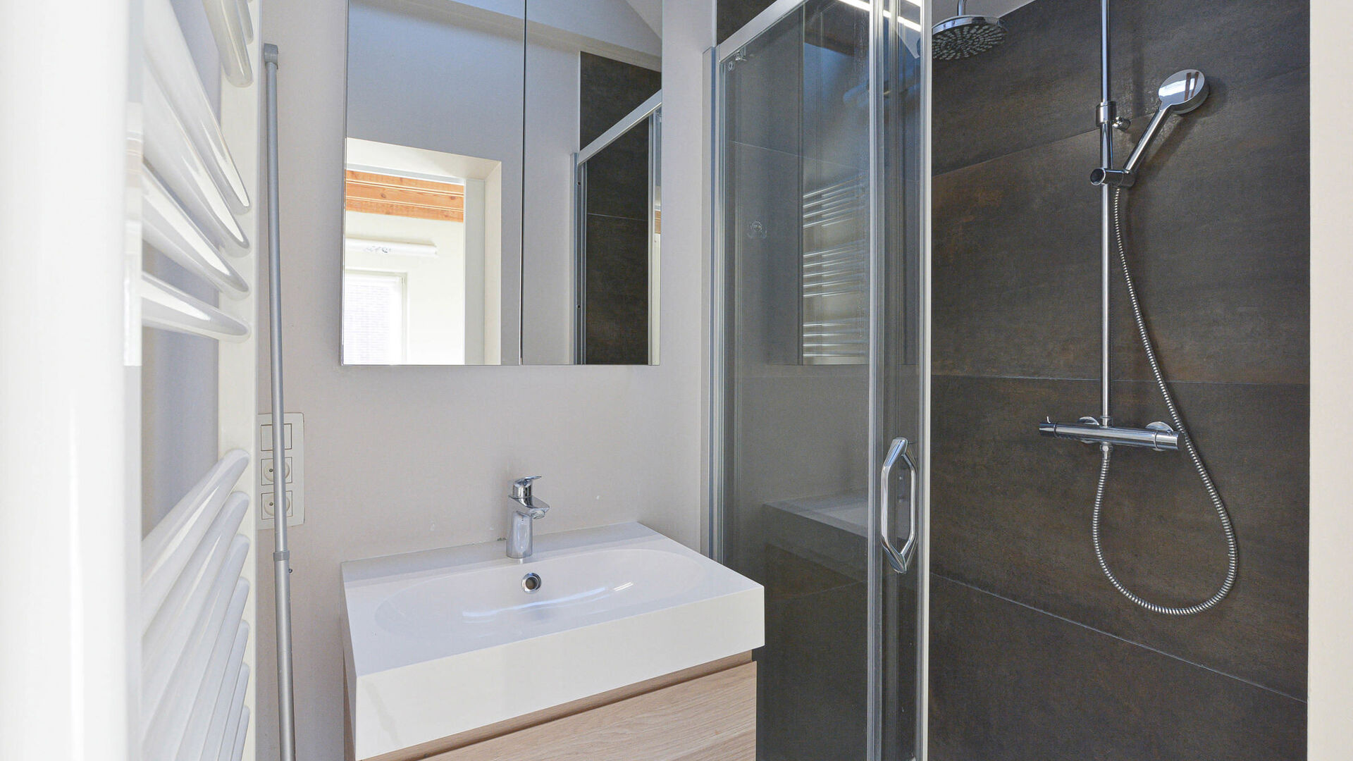 Chambre parentale de +/-15 m² avec placards intégrés, salle de douche avec évier et toilette séparée.
