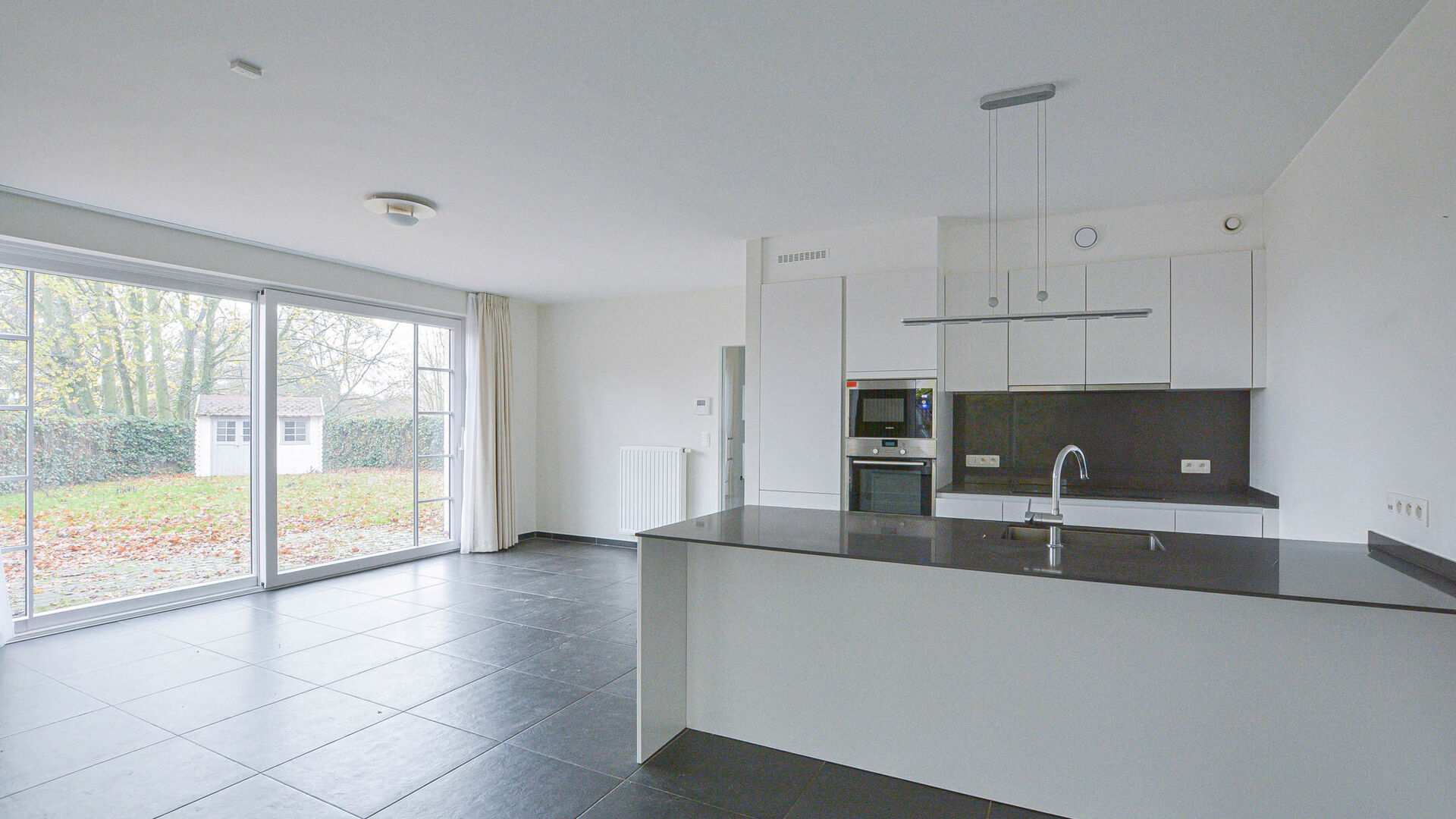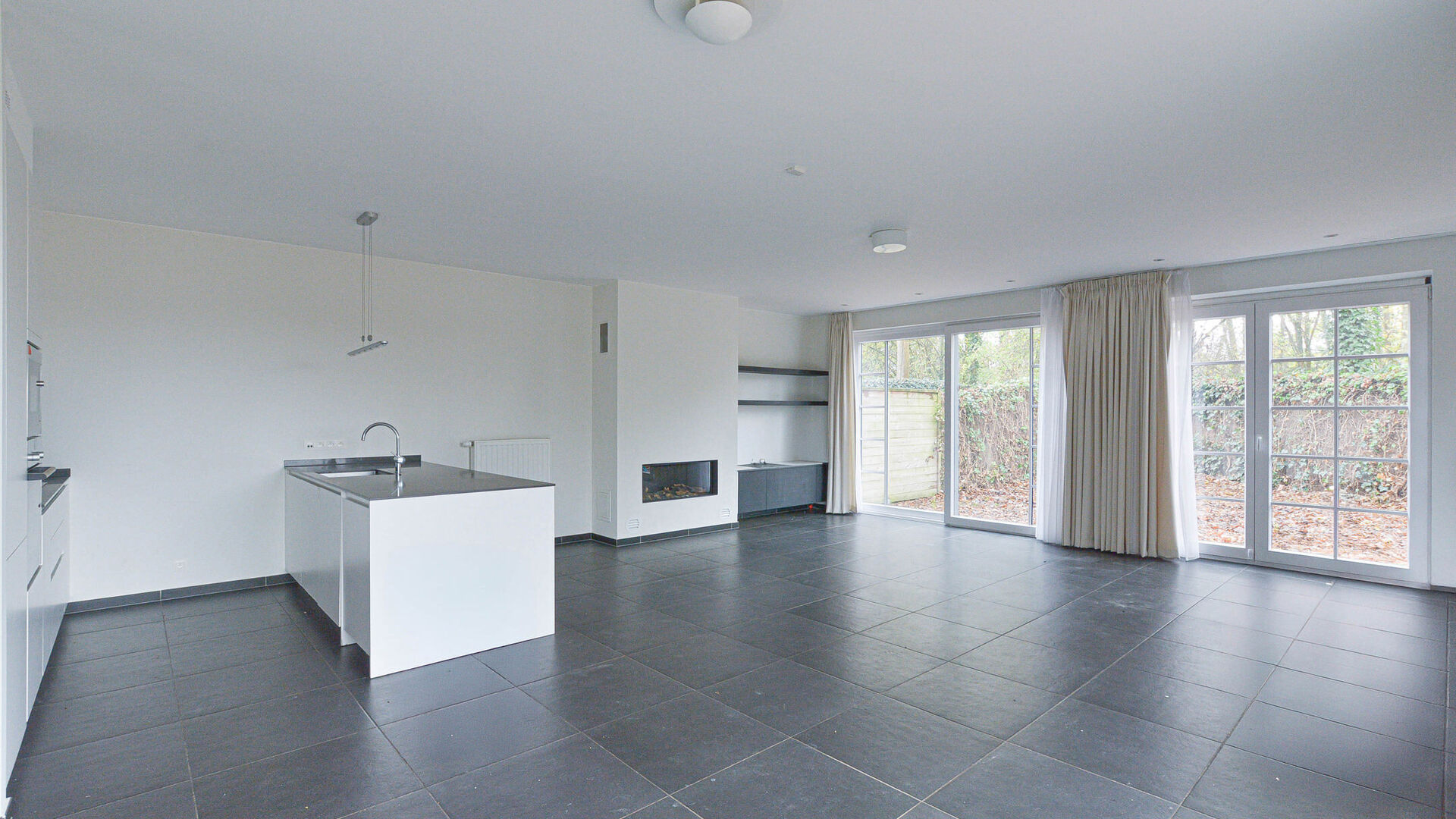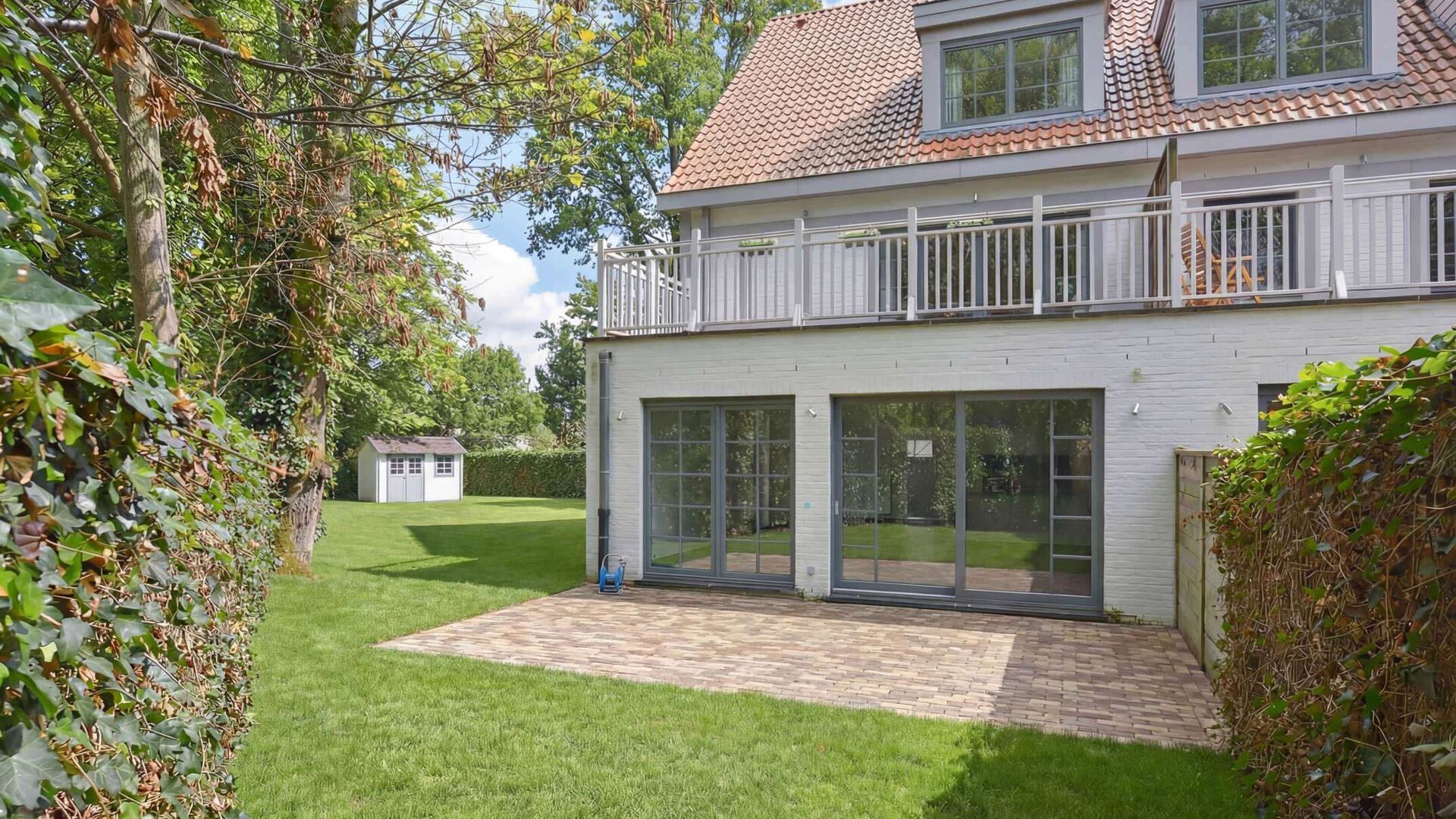 - Rez-de-chaussée : Hall d'entrée avec toilette invités et vestiaire encastré, lumineux séjour – salle à manger de ± 40 m² avec feu ouvert et donnant accès à un jardin avec terrasse et abri de jardin orienté Ouest, superbe cuisine entièrement équipée de +/-10m² avec îlot central, et un garage une voiture ainsi qu’un emplacement extérieur sur l’allée de garage.