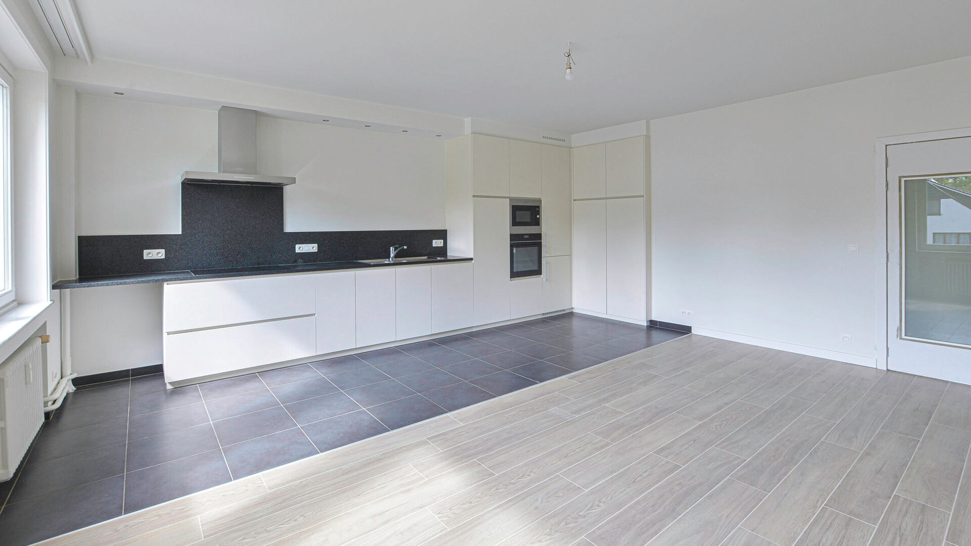 À l’étage, vous découvrirez un bel appartement entièrement rénové d’environ 98m². Il se compose d’un hall d’entrée avec placard intégré et WC séparé, d’un séjour lumineux avec cuisine ouverte entièrement équipée (taques à induction, four, micro-ondes, frigo, congélateur, lave-vaisselle) d’environ 30 m², de deux chambres avec placards intégrés (±12,6 m² et ±18 m²), ainsi que d’une salle de douche moderne avec un évier.